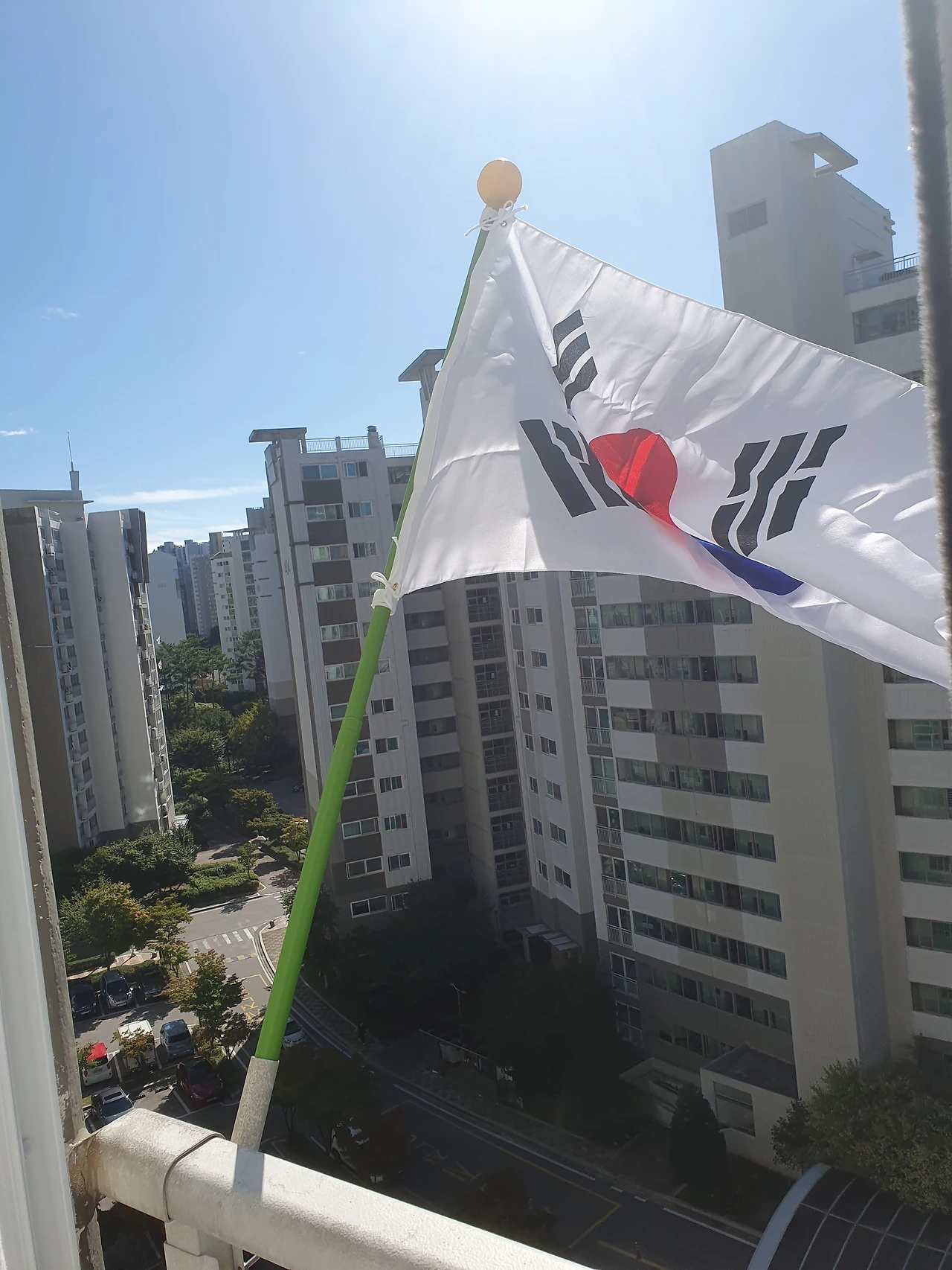 이사오기 전 집에서는 베란다에 짐이 많아서 게양대가 있는 쪽 유리문을 열지 못했다. 지금 사는 집은 탁 트인 유리창쪽에 국기 게양대가 있다. 이제 태극기를 꺼내어 달면 된다.