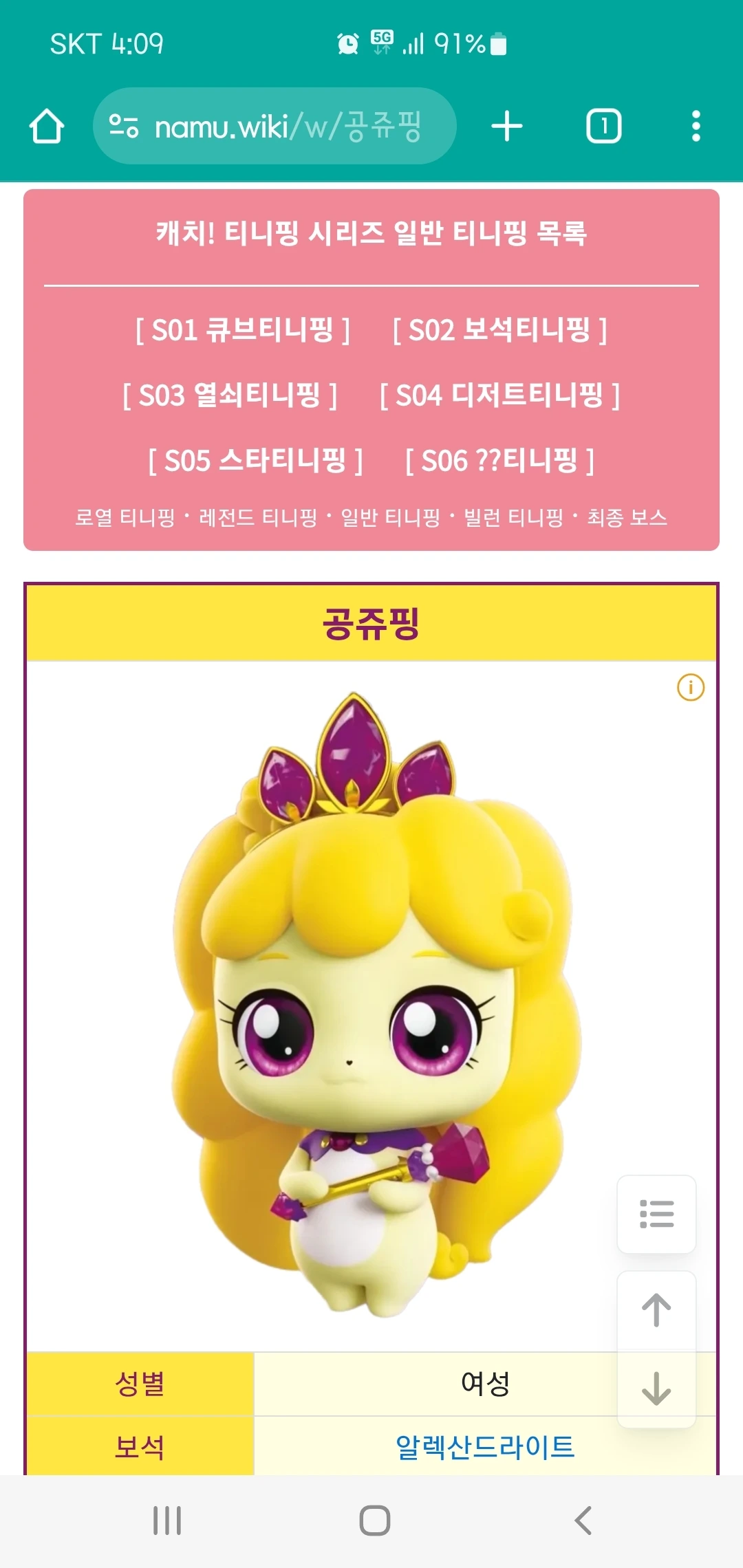 티니핑 시즌2에 나왔던 '공쥬핑' 피겨를 따라 그렸던 그림이다. 너무 안 닮아서 다시 그렸는데...