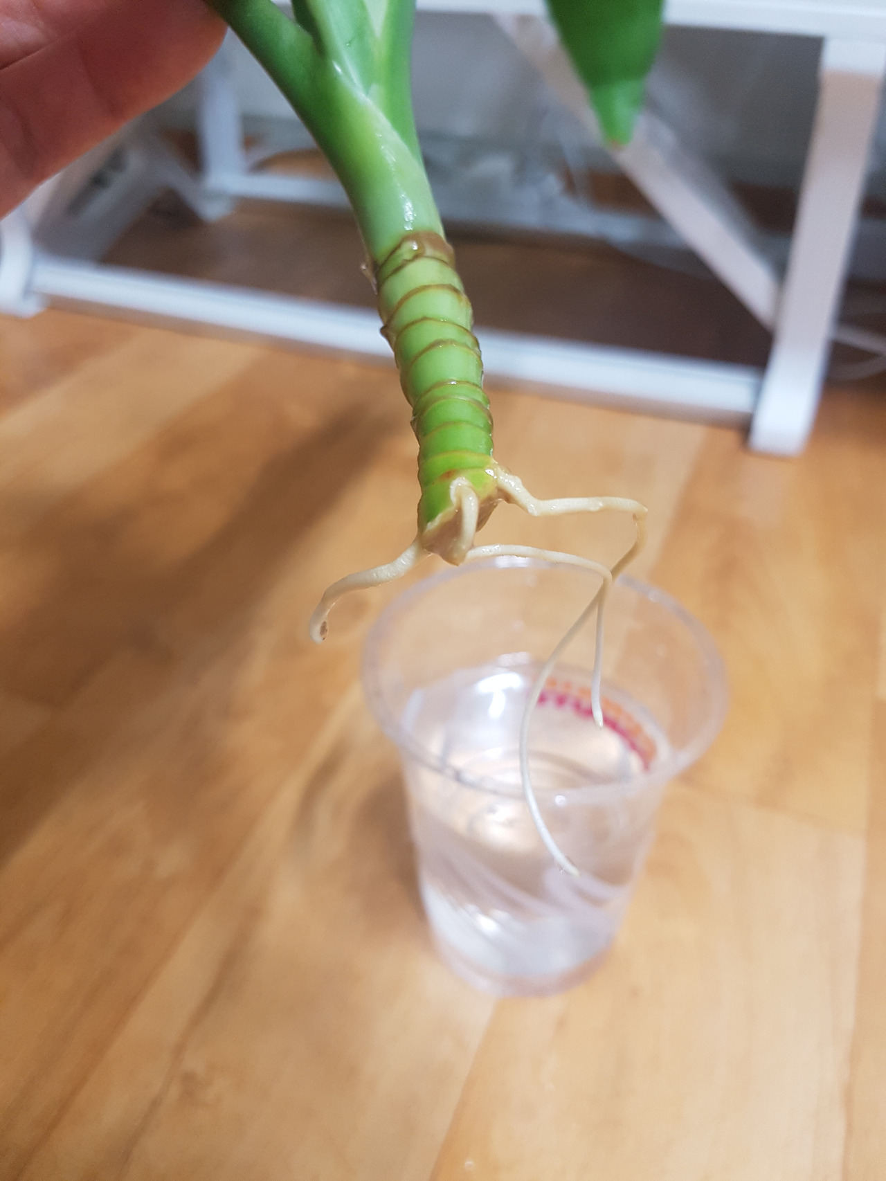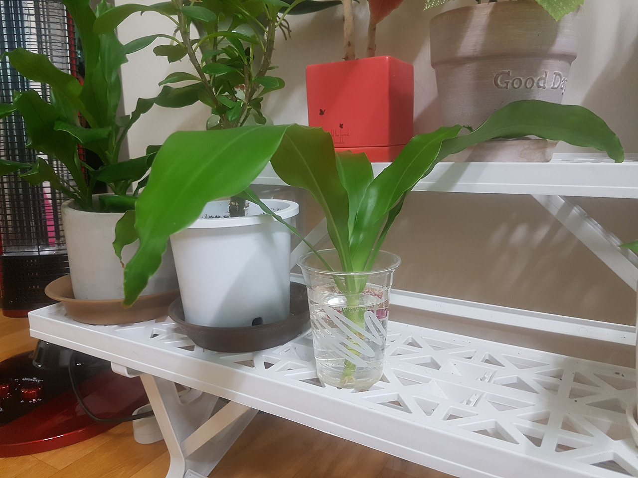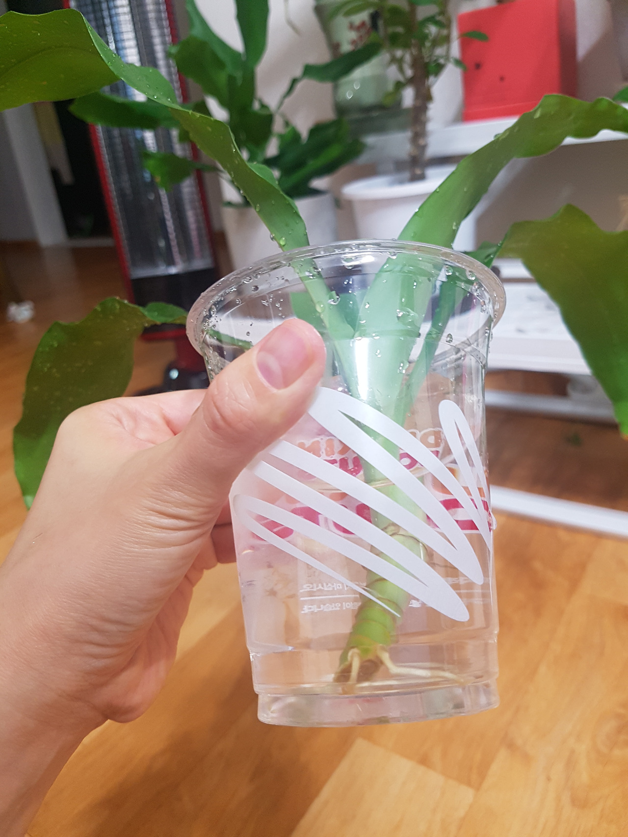 행운목에서 잘라낸 잎을 물에 꽂았다.
