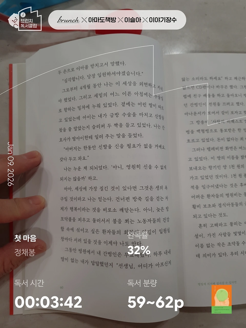 "아버지는 한동안 신발을 신을 필요가 없을 거예요. 갖다 두고 와요." 나는 누운 채 되뇌었다. '아니, 영원히 신을 수 없게 되지는 않을까'하고. 아아. 세상에 가장 질긴 것이 있다면 그것은 생의 욕구일 것이라고 나는 믿는다. 건너편 방죽 길을 걷는 자체가 행복이라는 것을 비로소 깨닫는다. - p62 __________ 작지만 소소한, 아니 너무 당연하게 누리는 많은 소중한 나의 일상에 감사하게 된다. 매일 3분이라도 나를 위해 온전히 내어줄 시간을 누리고 있음에 깊이 감사했다. 코로나 때 불현듯 간염되어 갑자기 짐을 챙겨 홀로 앰블런스를 타고 집을 떠나면서, 당시 5살이었던 어린 딸에게 사무치게 미안했던 순간이 떠올랐다. 아.. 정말. 매일 나는 감사하고 살아야겠다. 진심으로.. 잊고 지냈구나. 그 사이에.
