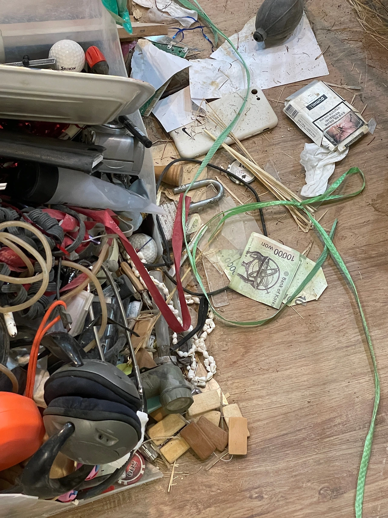 지푸라기와 비어있는 담뱃갑, 병뚜껑, 엉켜있는 액세서리 같은 것들로 기억을 하는데