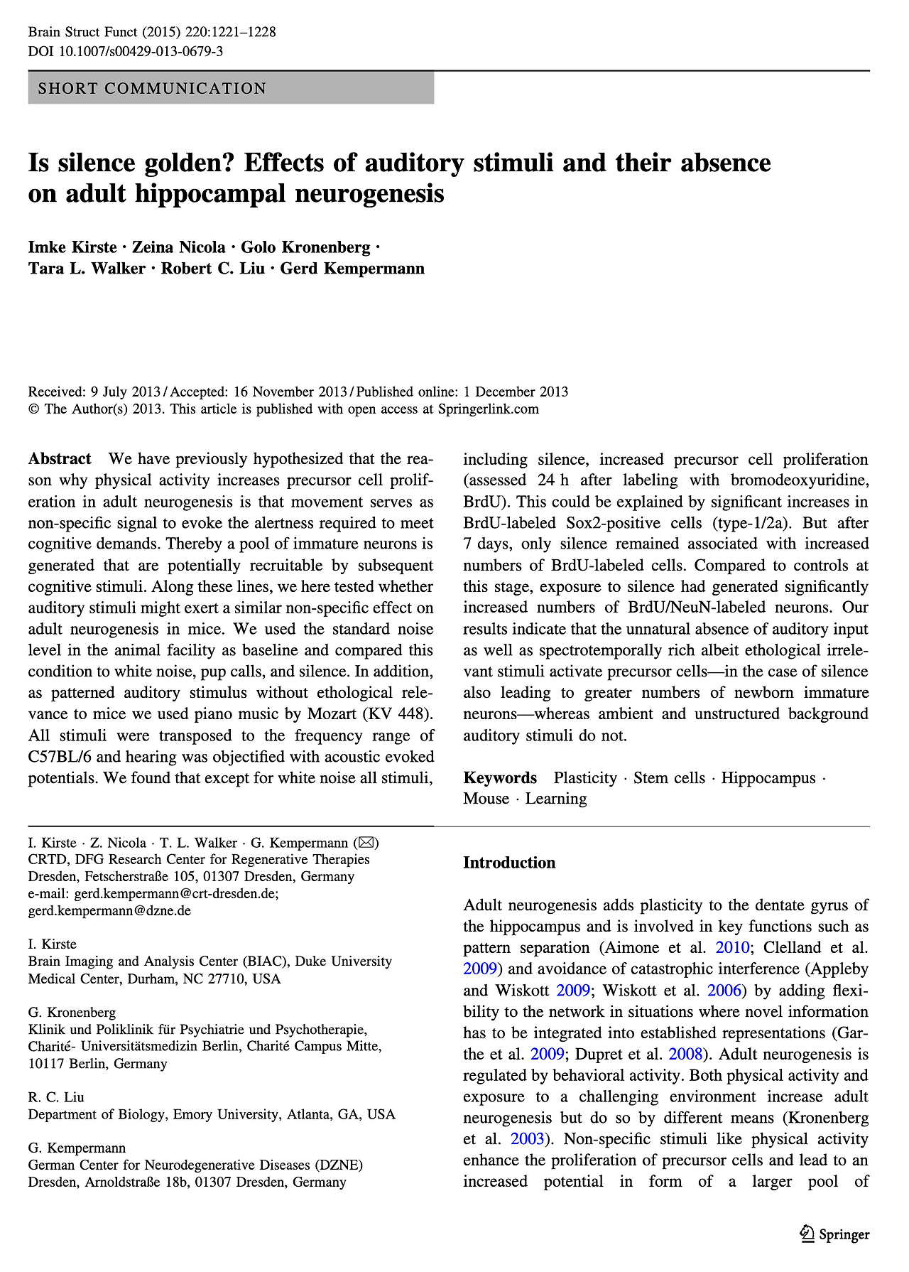 2013년, 미국 듀크 대학교(Duke University)의 임케 커스테(Imke Kirste) 박사 연구팀은 생물학 저널 <Brain Structure and Function>에 놀라운 연구 결과를 발표했습니다. 쥐에게 다양한 소리 자극(백색 소음, 모차르트 음악, 침묵)을 주었을 때 뇌의 변화를 관찰한 것입니다.