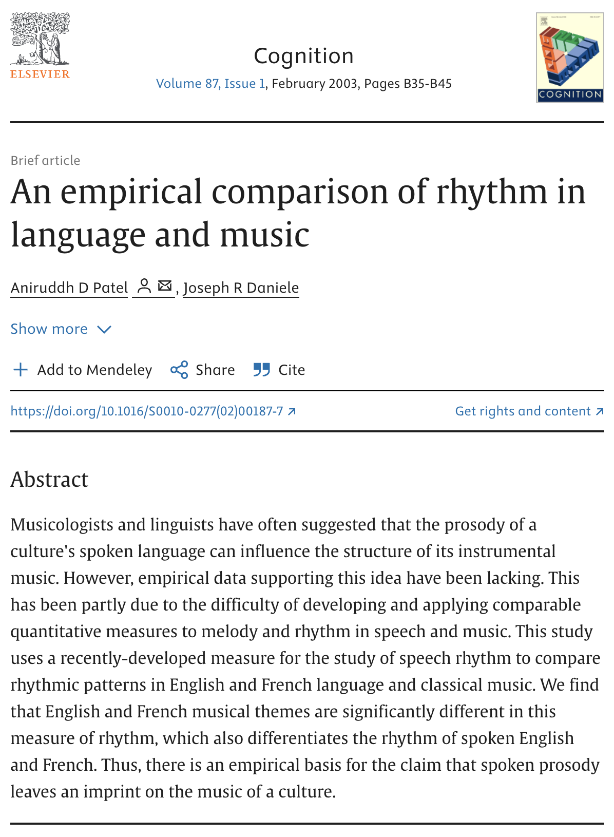 2003년, 미국의 신경과학 연구소(The Neurosciences Institute)의 아니루드 파텔(Aniruddh D. Patel) 박사와 조셉 다니엘(Joseph R. Daniele) 연구팀은 인지과학 저널인 <코그니션(Cognition)>에 음악계와 언어학계를 동시에 뒤흔든 논문을 발표했습니다. 논문의 제목은 "언어와 음악 리듬의 실증적 비교(An empirical comparison of rhythm in language and music)"였습니다.