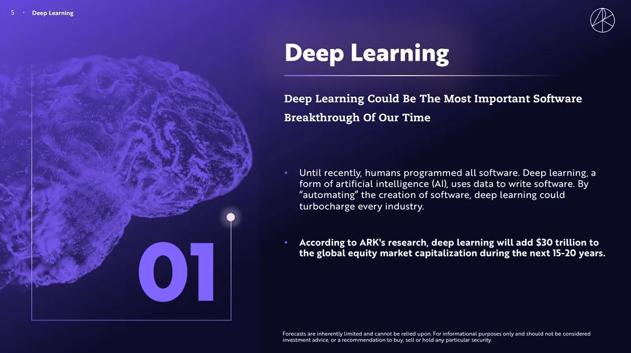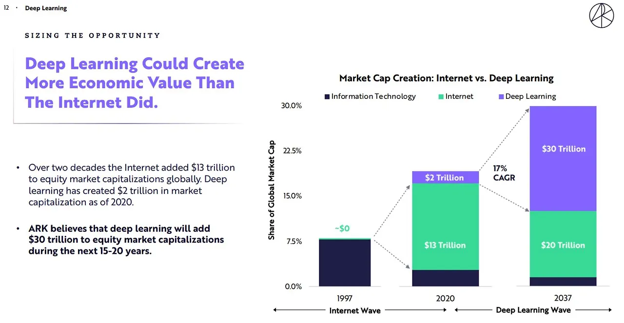 결국, 이러한 머신러닝과 딥러닝의 질문이 GPU와 같은 도구를 만나면서 무언가 폭발적인 변화를 만들어내고 있는 것으로 보였다. 참 아이러니한 부분은 '어떻게 명령할 지 알고 있는 것 이상을 컴퓨터가 처리하는 것'의 핵심이 연산 능력에서 비롯되고 있다는 점이다. 연산 능력의 극대화를 통한 컴퓨터 스스로의 데이터 트레이닝과 규칙의 발견. 그런 것들이 얼마나 세상에 큰 변화를 줄 수 있을까도 싶지만, 테슬라누나는 딥러닝이 향후 15~20년 동안 주식시장에 $30 trillion의 가치를 창출할 것으로 예상한다.