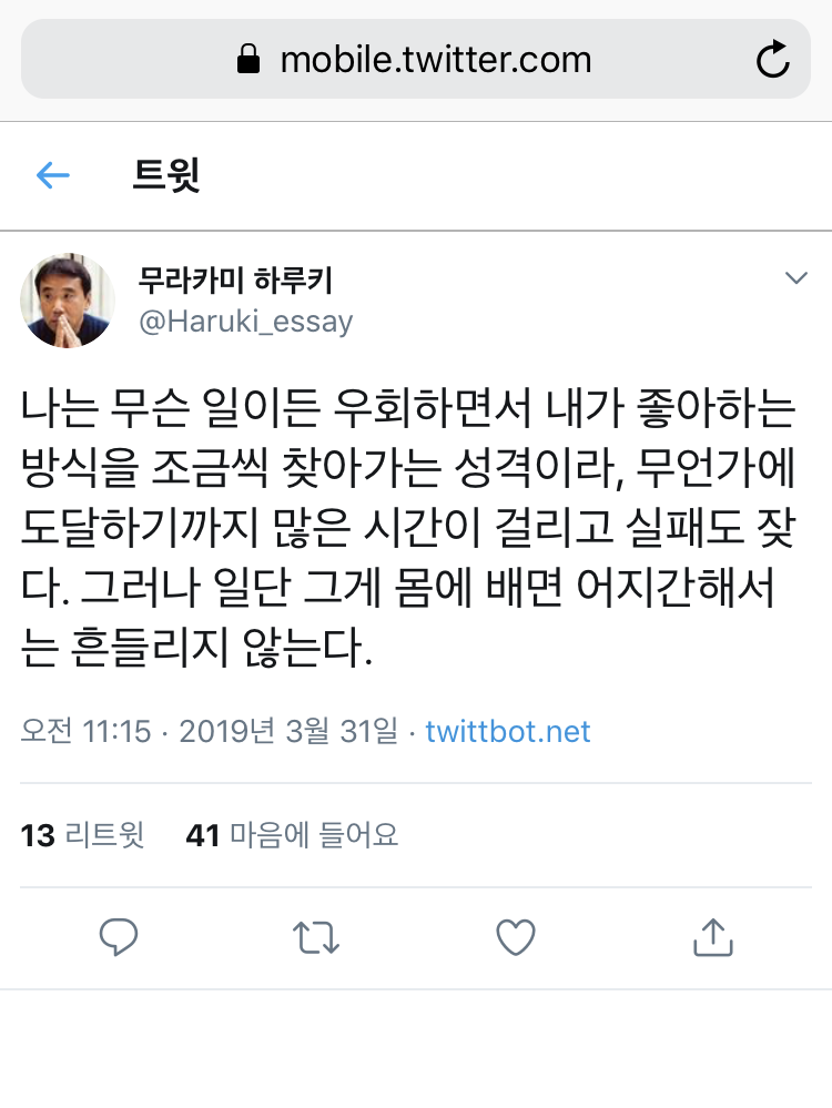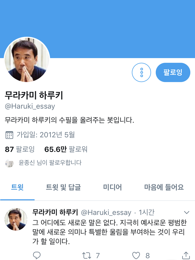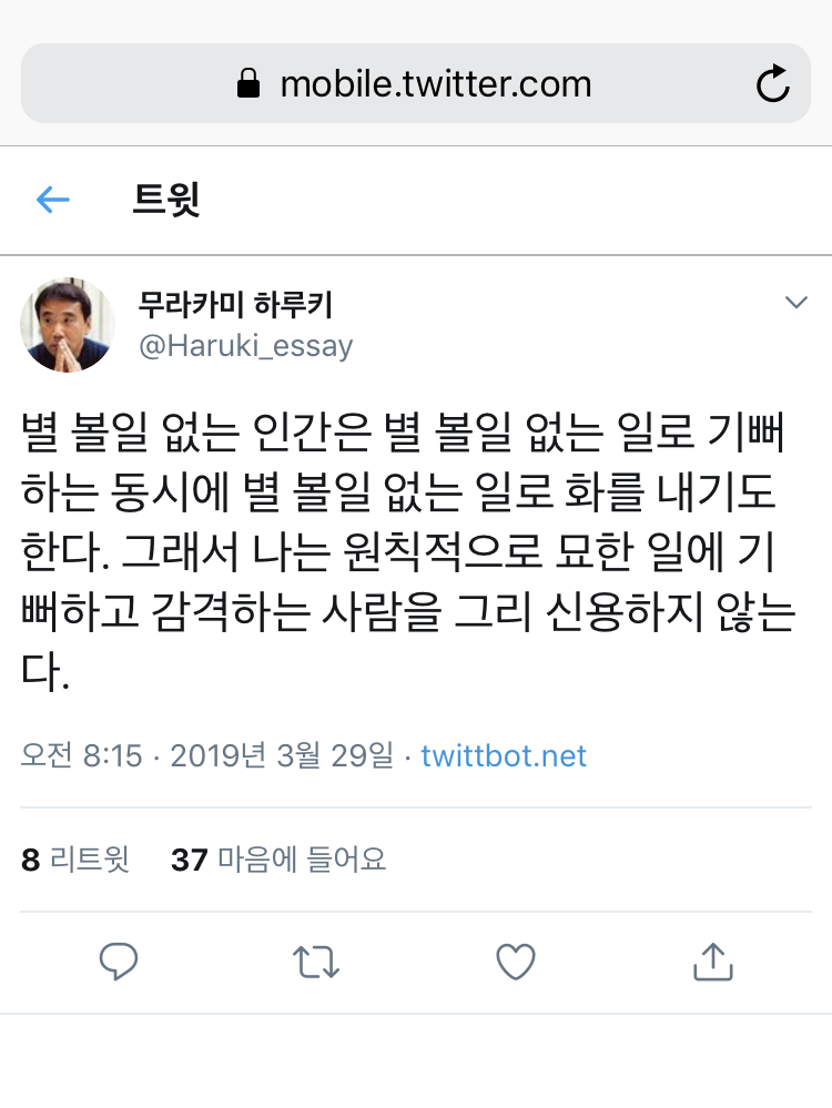 하루키의 수필을 짧게 잘라 올려주는 트윗인데, 이것 때문에 트위터를 삭제할 수가 없다.