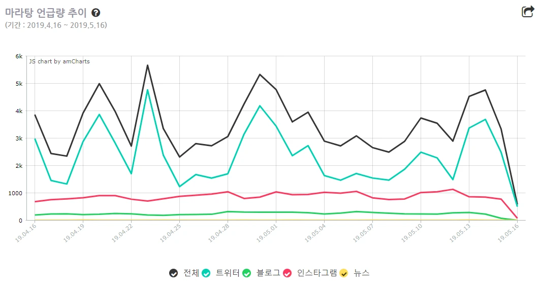 소셜메트릭스로 마라탕을 검색해 보면 몇 가지 재밌는 데이터가 보인다.
