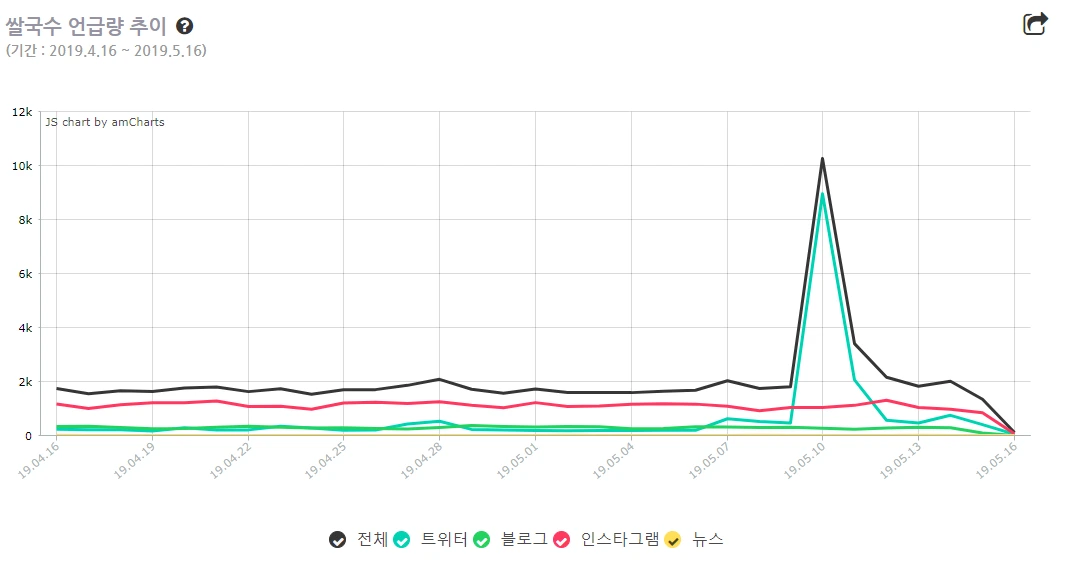 그런데 소셜에서 언급된 양을 보면, 마라탕이 쌀국수에 비해 월등히 많은 언급량을 보인다.