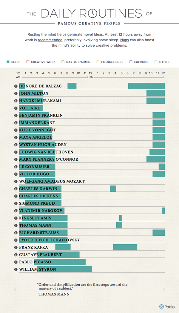 자료를 보니, 예술적인 영감이 중요한 창작자들도 나름 규칙적인 생활 패턴을 가지고 있다는 점이 재밌다. 물론 루틴 자체는 여러가지 유형, 이를테면 아침형, 올빼미형 같은 유형이 나뉘는 것 같다. 이미지를 보면 맨 위 발자크부터 그 아래로 주욱 빅토르 휴고까지 12시 이전에 잠자리에 들어 오전 6시 이전에 기상한다.(발자크의 경우 저녁 6시에 취침해서 새벽 1시에 일어나는데... 이거 정말 가능한 일인가?)