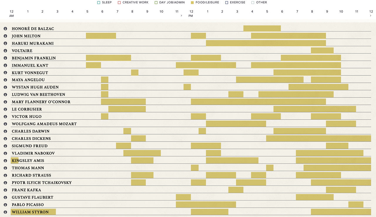 SNS를 통해 알게 된 사이트인데, 유명 창작자들의 하루 루틴을 시각화해서 자료로 보여준다. 소설가로는 하루키의 이름도 보이고, '토니오크뢰거'의 토마스만, 그리고 카프카의 이름도 보인다. 베토벤, 모차르트, 차이코프스키 같은 음악가와 화가인 피카소의 이름도 보이는데, 이들의 일과표를 한 눈에 볼 수 있다는 점이 재밌다.