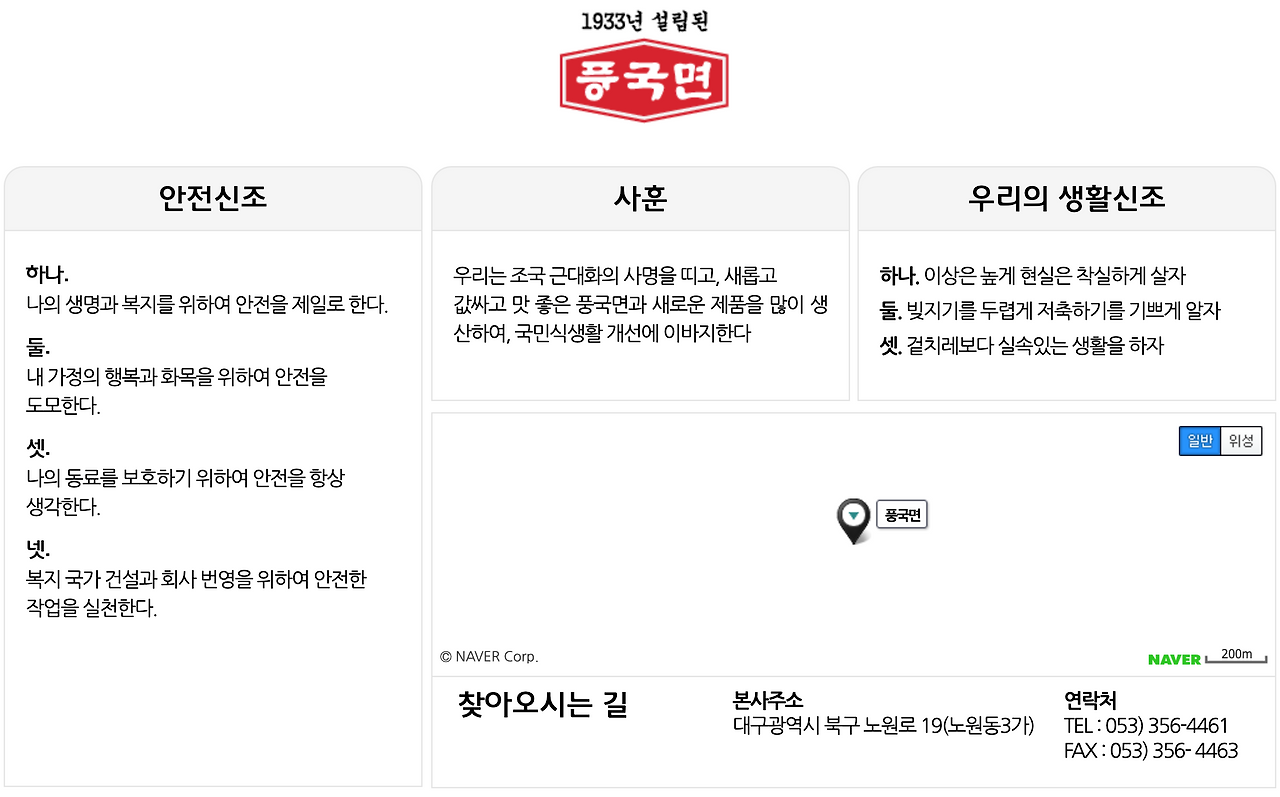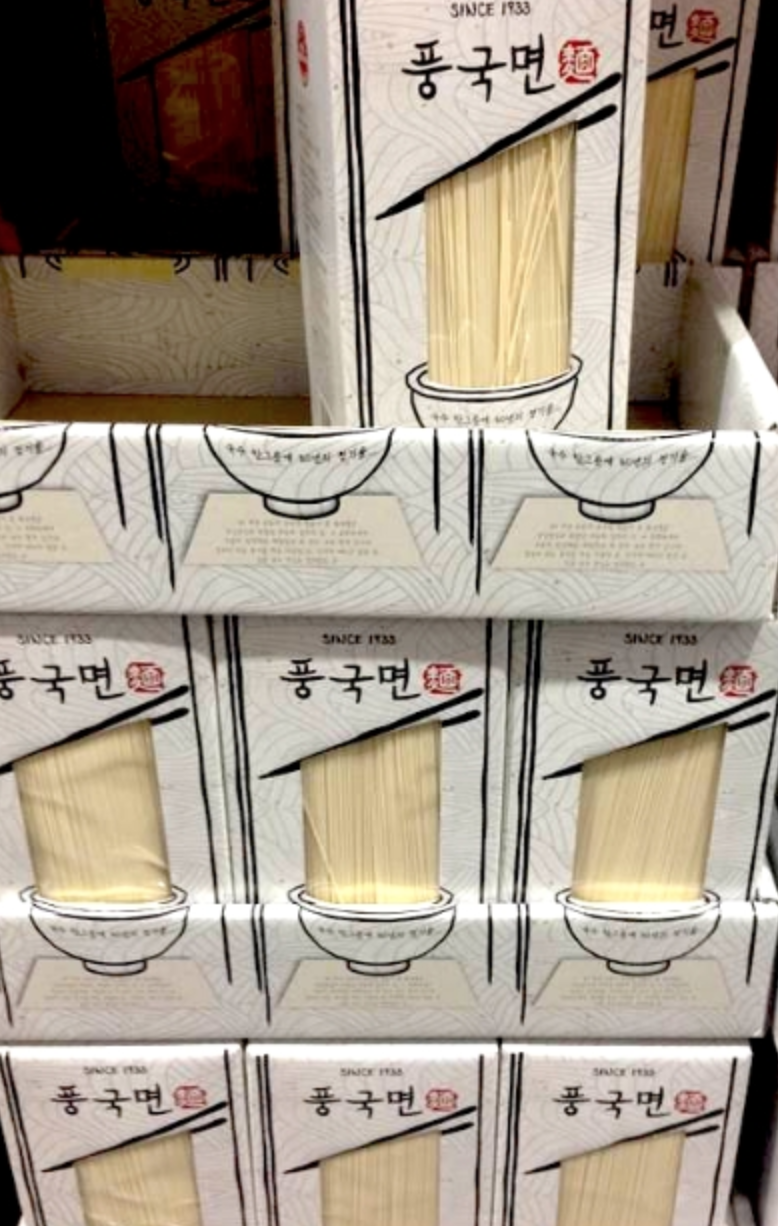 흥미가 생겨서 살펴보니, 풍국면은 우리나라에서 가장 오래된 국수 회사였다. 1933년에 생겼으니까, 백 년 가까운 역사를 가진 회사였다. 인상 깊은 것은 회사 이름이 '(주)풍국면'이라는 부분. 백 년 정도의 역사를 가진 회사라면 처음엔 풍국면으로 시작했어도 지금쯤은 못해도 풍국식품 정도의 회사명을 욕망할 법한데, 회사 이름 자체가 여전히 풍국면이었다. 대기업 중심의 사업 확장 및 수직계열화가 일반적이었던 한국에서는 흔치 않은 케이스로 생각된다. 과연 국수 하나만 가지고, 크고 작은 식품기업 사이에서 백 년 가까이 회사를 경영해 왔다는 것은 어떤 의미일까?
