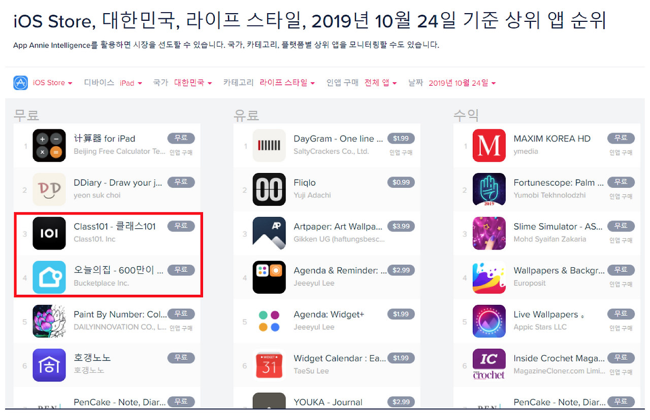 그런데, 최근 클래스101 관련 재미있는 데이터 하나를 보게 됐다. 클래스101이 교육이 아닌 라이프스타일 카테고리로 분류된 데이터인데, 재밌는 것은 클래스101 바로 아래 순위를 차지하고 있는 서비스가 '오늘의 집'이란 점이다. 해당 데이터를 기준으로만 본다면 클래스101이 오늘의집을 이긴 것인데, 이건 한 번쯤 짚어볼 부분이 있는 것 같다. 2019년 기준으로 '오늘의집'은 월간 앱 이용자 수가 100만 명을 상회하는 서비스다. 더욱이 상반기에만 거래액이 1000억에 육박했다. 비록 기준이 iPad 기기 대상으로 한정적이긴 하지만, 이런 '오늘의집'을 작년 매출이 50억 정도 되는 '클래스101'이 제쳤다. 이걸 어떻게 해석해야 할까?