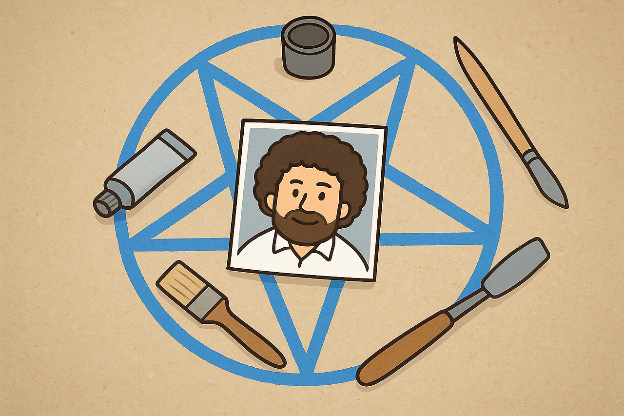 어릴 때 나는 엄마와 나란히 티브이를 보았던 기억들이 있다. 티브이에 나오는 아저씨는 멋진 수염에 풍성하고 개성있는 아프로 헤어를 하고 있었다. 아저씨는 아주 다정한 목소리로 설명을 하며 그림을 그리고 있었다. 아무것도 그려지지 않은 캔버스에는 멋진 풍경화가 그려져 나간다. 당시에 내가 알고 있는 색깔이라는 것은 "빨주노초파남보" 무지개 색깔밖에는 없었는데 아저씨는 "티타늄 화이트" 나 "반 다이크 브라운" 혹은 "프러시안 블루" 같은 멋들어진 물감을 팔레트에 과감하게 섞으며 마술을 부리고 있었다. "도대체 저런 물감은 어디서 구할 수 있는 걸까?" 생각하는 순간 캔버스 위에는 정말 멋진 풍경들이 만들어진다. 아주 짧은 시간에 캔버스 위에서 벌어지고 있는 마법을 보면 놀라움을 느낄 수가 있다. 대학교 수업내용을 듣고 있는 것처럼 "언제 저기까지 간 거지?" 하는 생각이 들었다. 그럼 이쯤에서 아저씨는 유행어 "참 쉽죠?" 라고 말한다. 모든 게 미스터리이다. 아저씨는 아이들이게 붓을 드는 재미에 대해 알려주려 하셨지만 대분분의 사람들의 "참 쉽죠?" 한마디에 붓을 내려놓게 만들었으니 그 유명한 프로그램이 조이오브 페인팅 "그림을 그립시다"이다. 지금 돌이켜 보면 참 그리운 시간들이다.