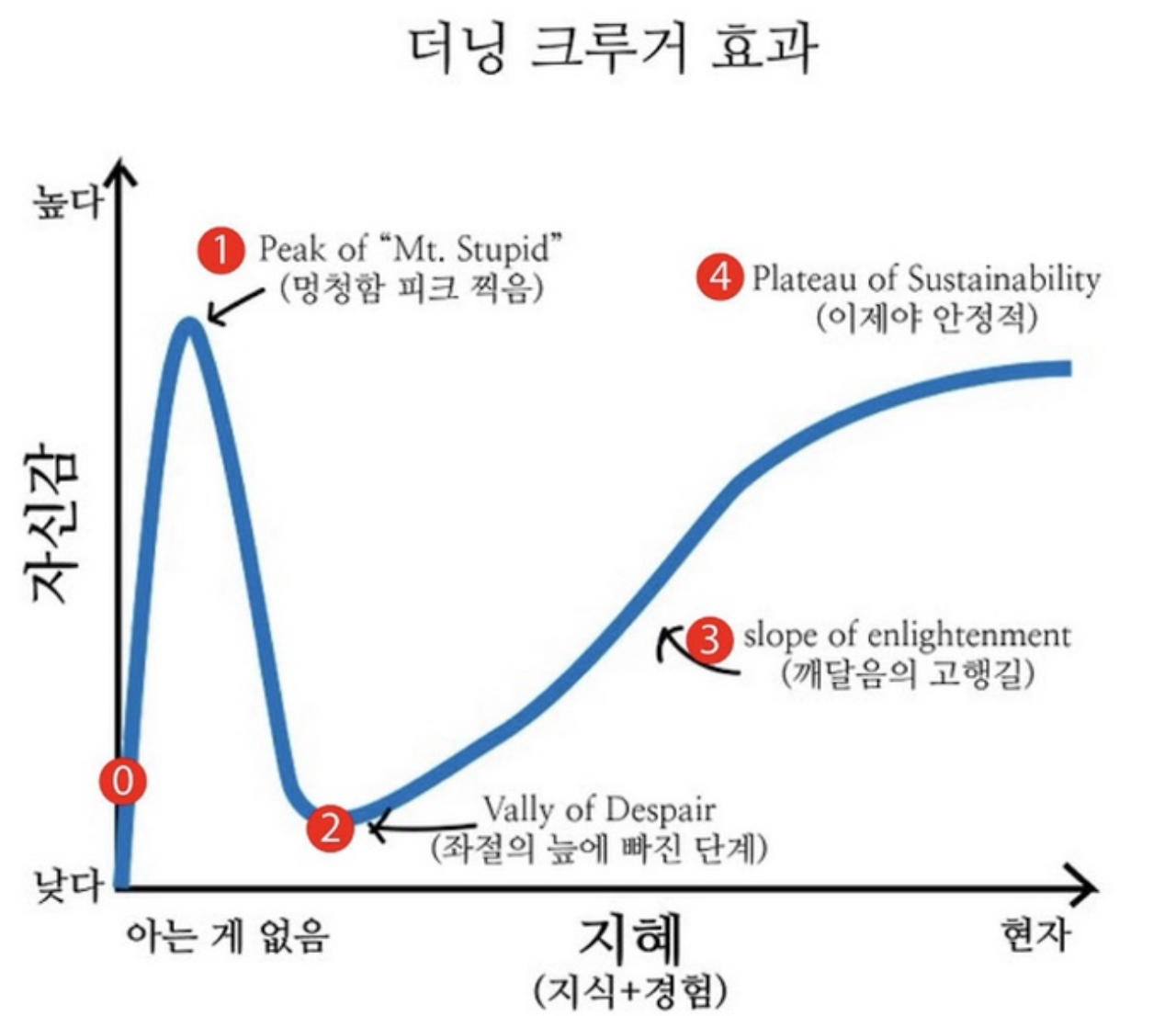 쉼 없이 달리며 정해진 인생의 퀘스트를 달성하는 것에만 집중하니, 정작 나를 들여다볼 마음의 여유가 없었다. 퇴사 후, 나와의 시간을 자주 가지며 깨달았다. 자신감 가득한 회사원 시절의 나는 Peak of "Mt. Stupid" 단계였다는 것을. Vally of Despair, 프리랜서 8개월 차의 나는 인생 처음으로 절망의 골짜기를 지나고 있다. 더닝 크루거 효과는 유명한 한 문장으로 요약할 수 있다. "무식한 사람이 용감하다."