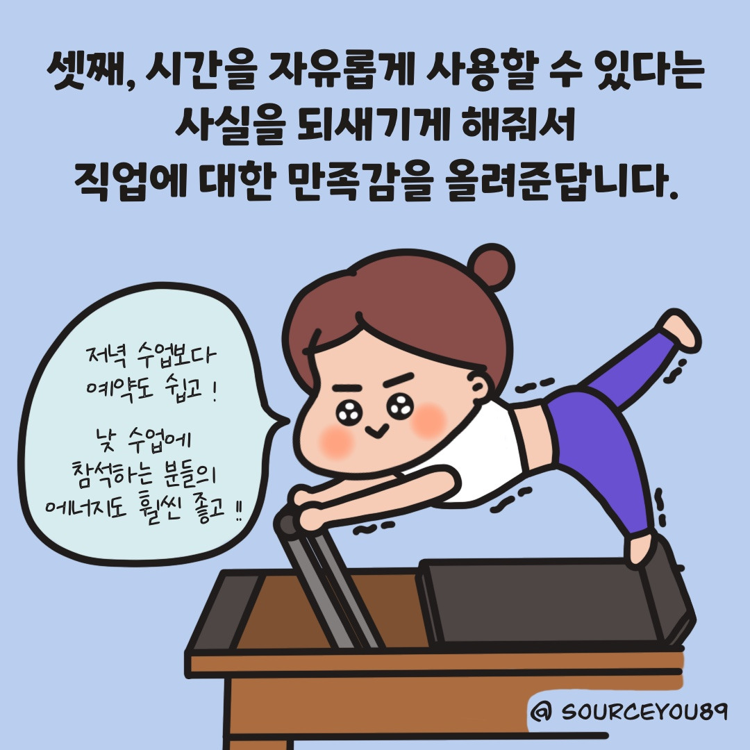 옷을 갈아입는 순간, 업무에 대한 생각은 잊고 오로지 저를 위한 시간 속으로 빠져든답니다. 상쾌한 오후 업무를 위한 활력 충전, 탄탄한 코어 근육 강화, 직업의 만족감 등… 필라테스가 제게 주는 행복은 너무나 커요.