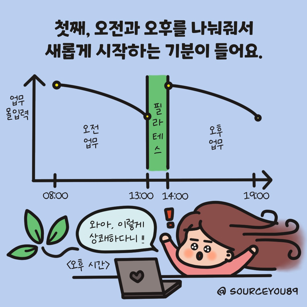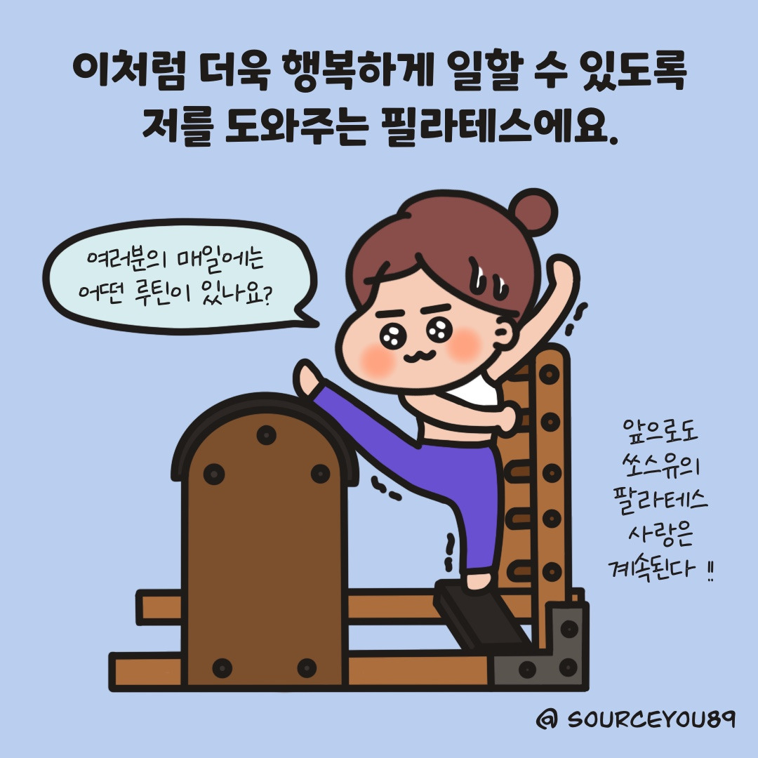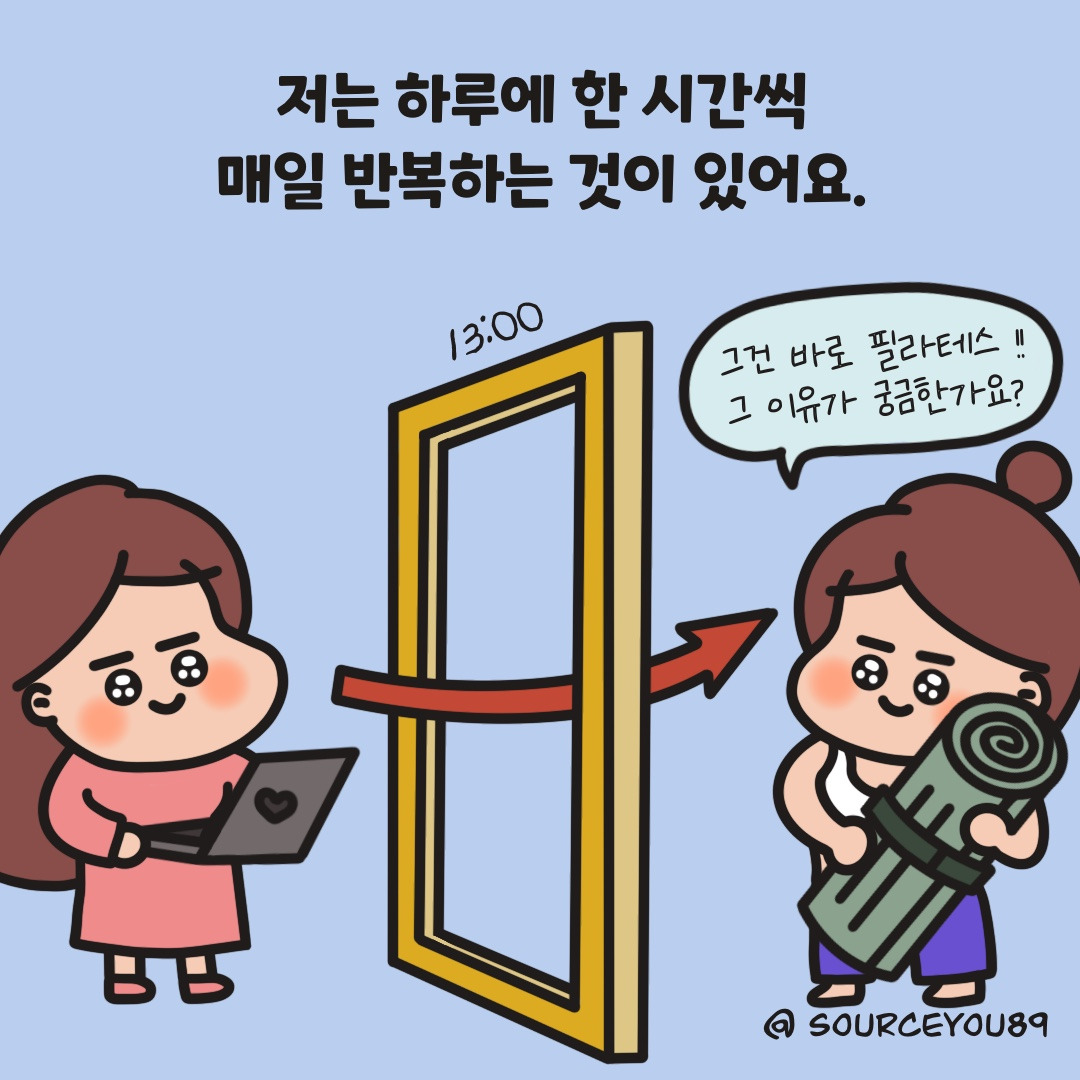 매일 오후 한 시는 제가 변신하는 순간이에요! 바로, 필라테스 수업을 받는 한 시간입니다 :)
