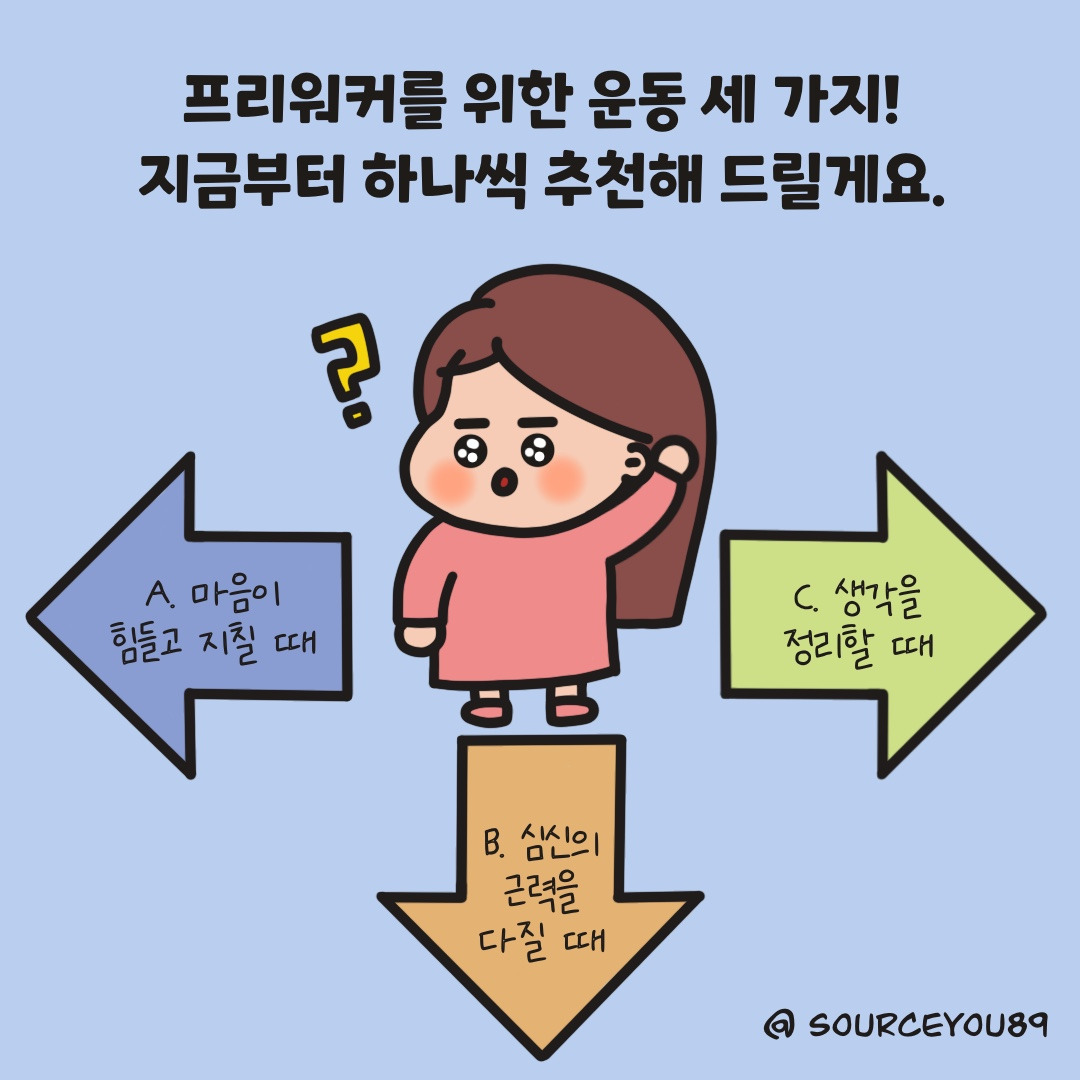 울타리 없이 오롯이 자신을 지켜내야 하는 프리워커는 생각과 감정을 스스로 다독이는 능력이 필수라고 생각해요. 그동안 여러 가지 방법을 시도했는데, 제게는 운동이 최고라는 것을 느꼈어요!