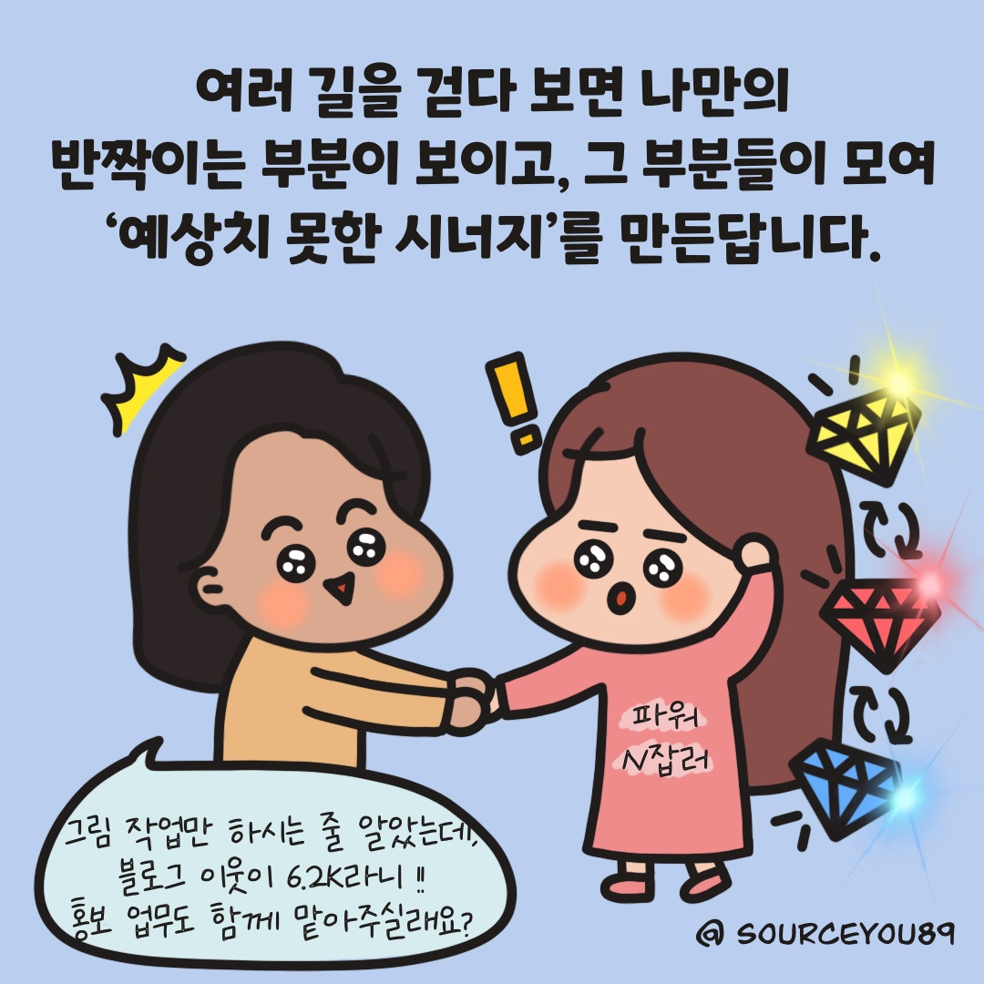 도전의 시기에는 최대한 많은 길을 걸어야 한다는 사실을 깨달았어요. 여러 길 위에서 우연한 기회와 예상치 못한 시너지가 찾아오더라고요. 그 기회와 시너지가 반복되며 결국 자연스럽게 나만의 능력과 전문성이 쌓이기 시작한답니다.