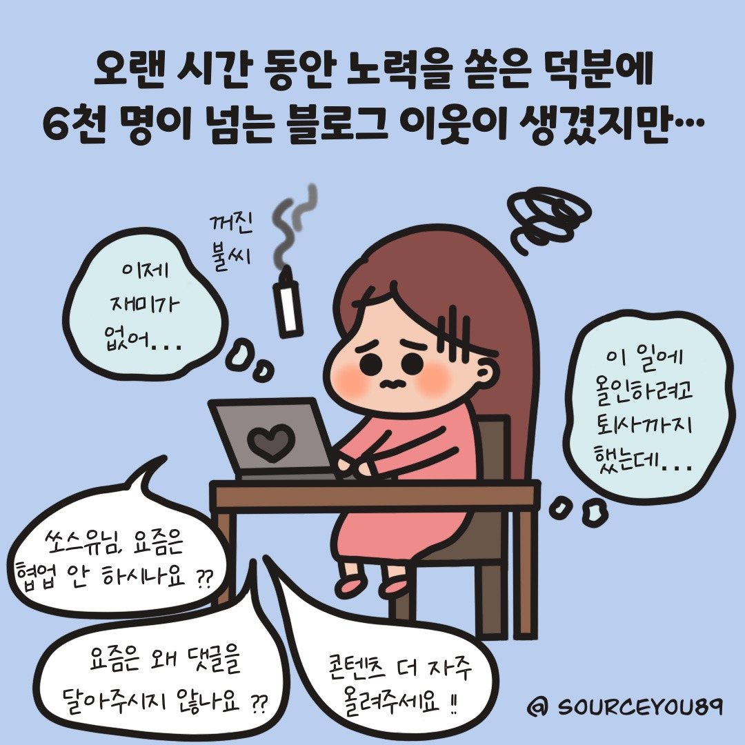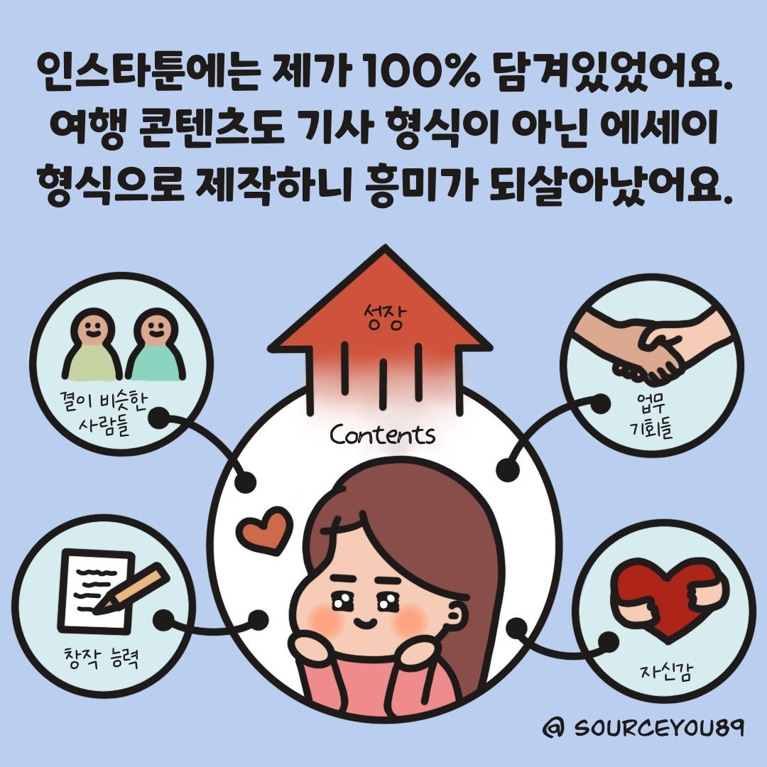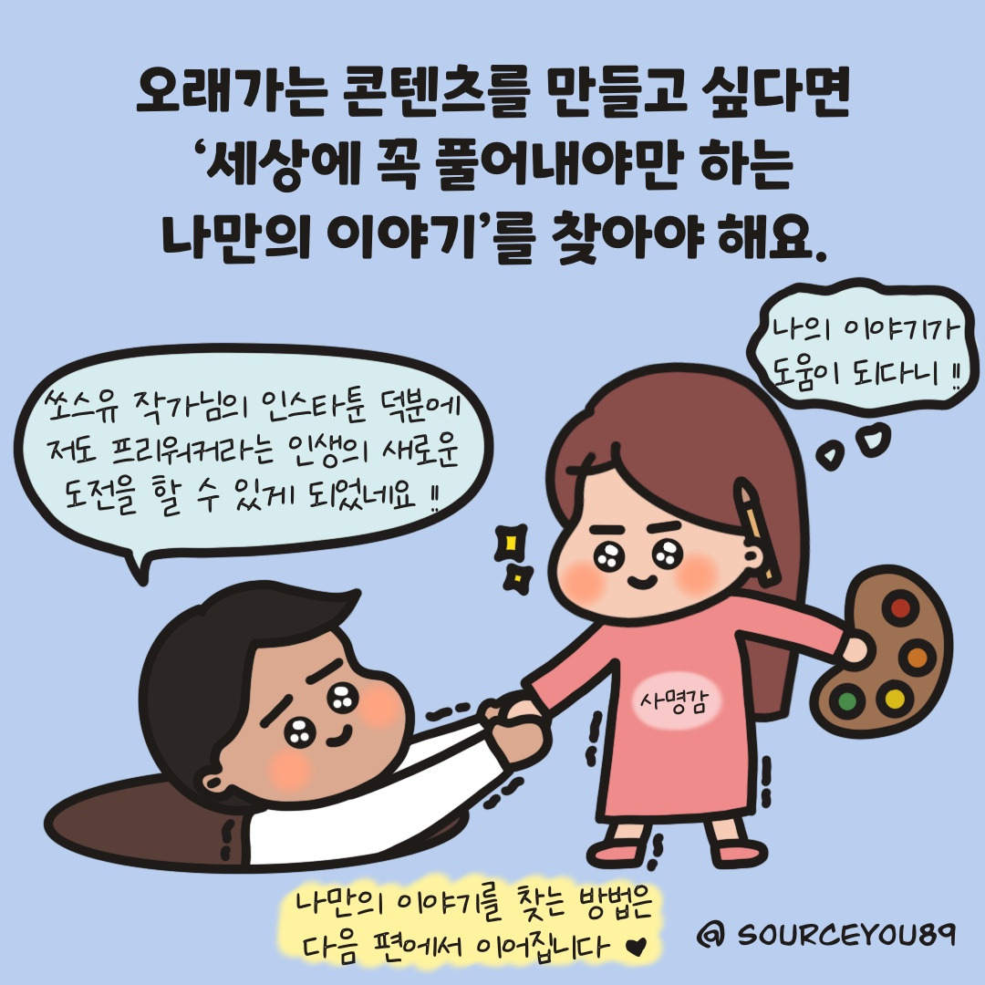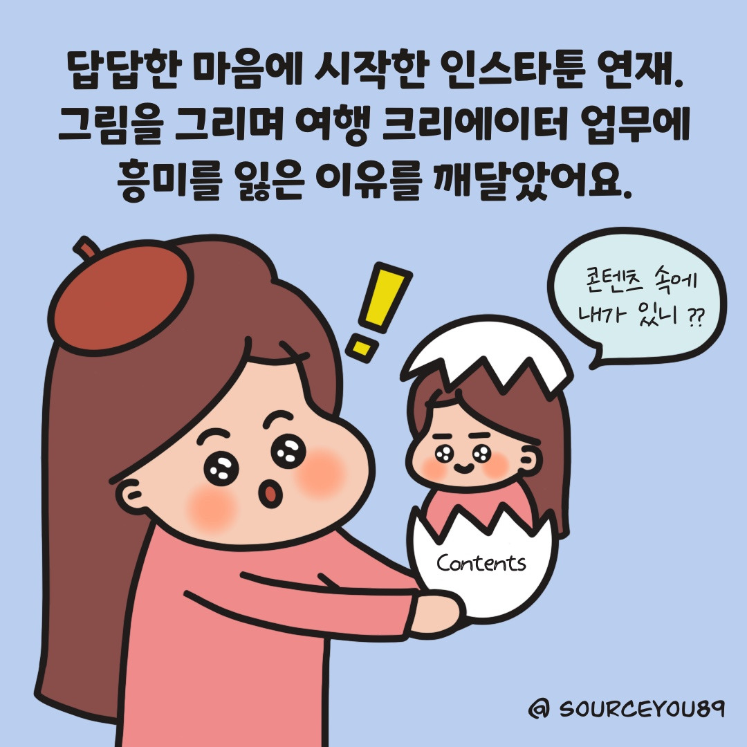 답답하고 불안한 마음을 털어놓기 위해 시작한 인스타툰이 의외로 제가 걸어가야 할 길의 방향을 알려주었답니다. 다음 편에서는 오래가는 콘텐츠를 만들기 위해 나만의 이야기를 찾는 방법을 보여드릴게요♥︎