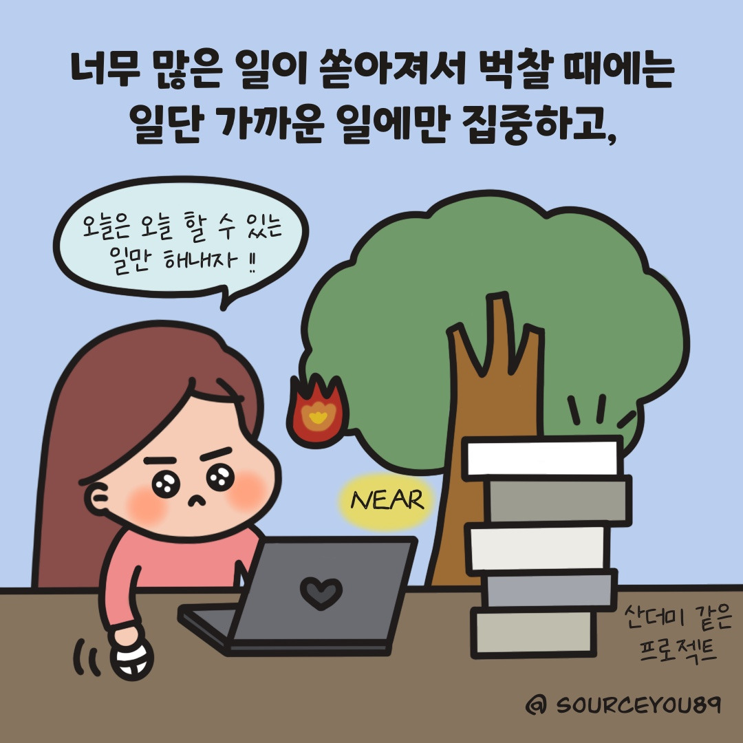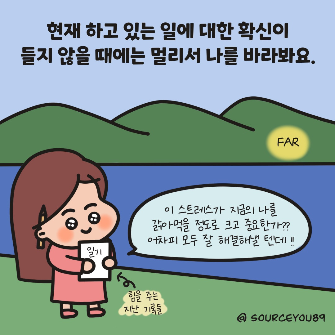 ‘와, 언제 다하지?’하는 생각에 압도될 때에는 지금 당장 하고 있는 하나의 작업에만 집중하고, 문득 ‘지금 내가 하는 일이 의미가 있나’ 의구심이 들 때에는 먼 곳에서 저를 바라보며 옳은 길을 걷고 있음을 확인해요 :)