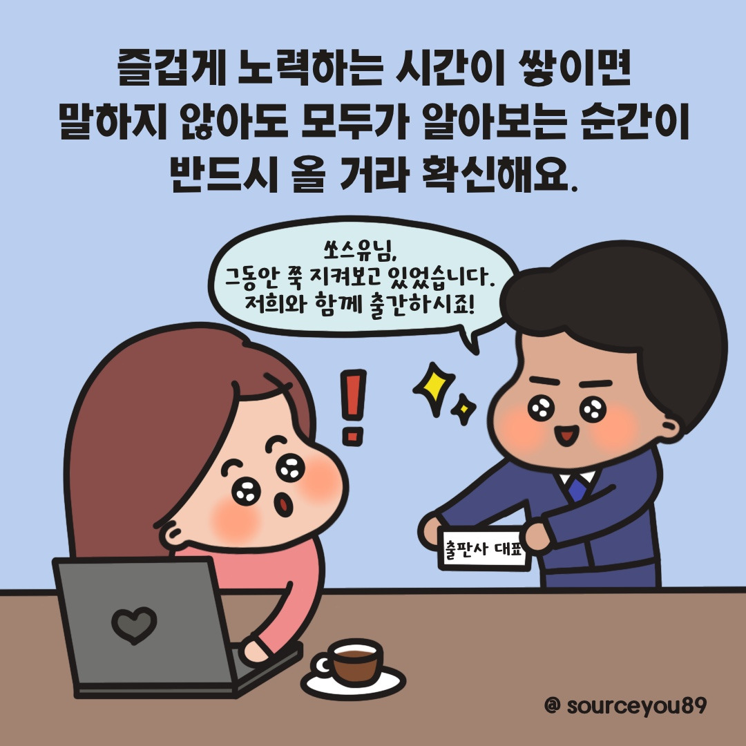 프리워커가 된 지 아직 1년도 채 되지 않은 지금은 때때로 혼자 무음의 확성기로 저를 알아달라고 외치는 기분이 들기도 하지만, 꾸준히 즐기는 진심의 시간이 쌓이면 마침내 ”쏘스유님, 말하지 않아도 당신을 알아요.”라는 말을 듣게 될 날이 올거라 확신해요♥︎