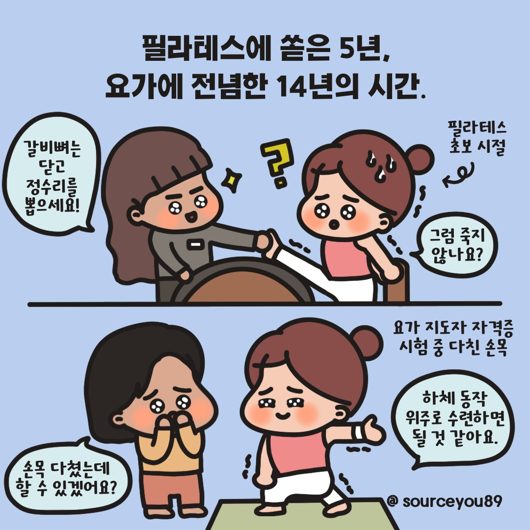 지금은 요가와 필라테스를 할 때 전문가 같다는 말을 듣지만, 당연히 초보인 시절도 있었고 부상을 당한 날도 있었어요.