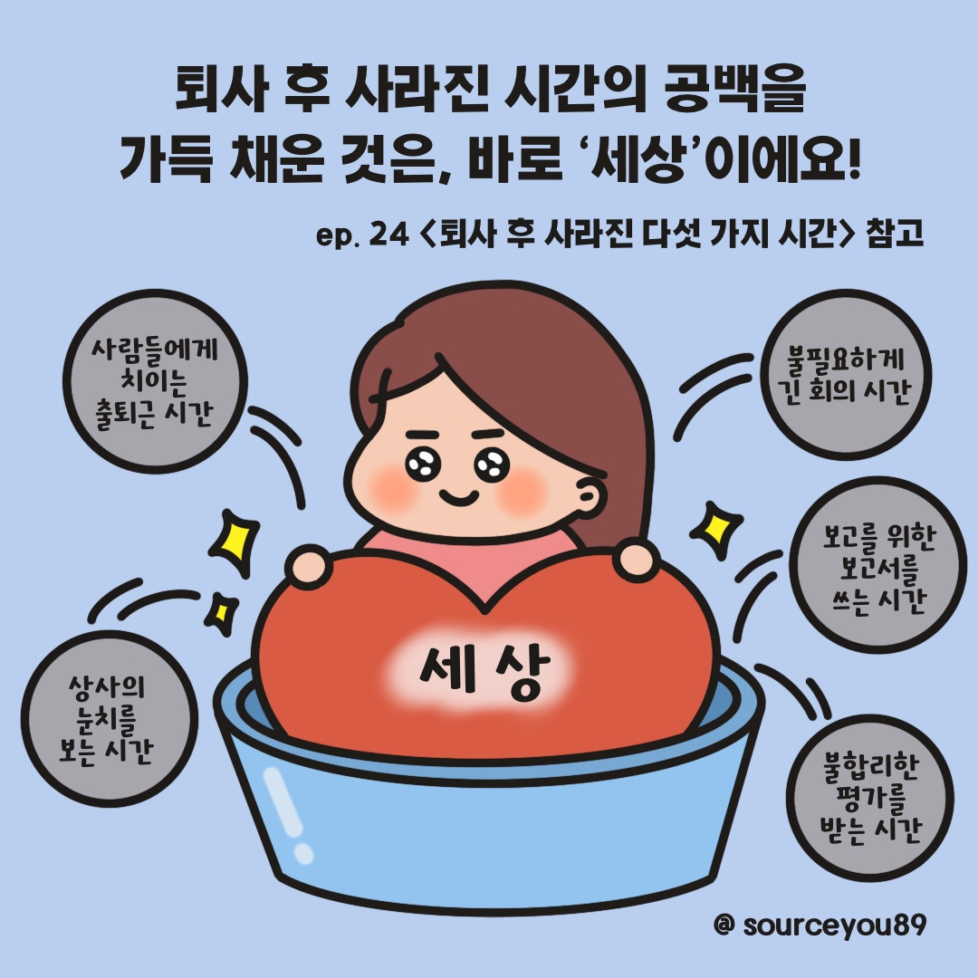 24화 <퇴사 후 사라진 다섯 가지 시간> 에피소드의 인기가 많아서 깜짝 놀랐어요! 퇴사 후 새롭게 생긴 시간에 대해서도 궁금해하셔서 <퇴사를 했더니 찾아온 변화> 시리즈를 기획했어요.