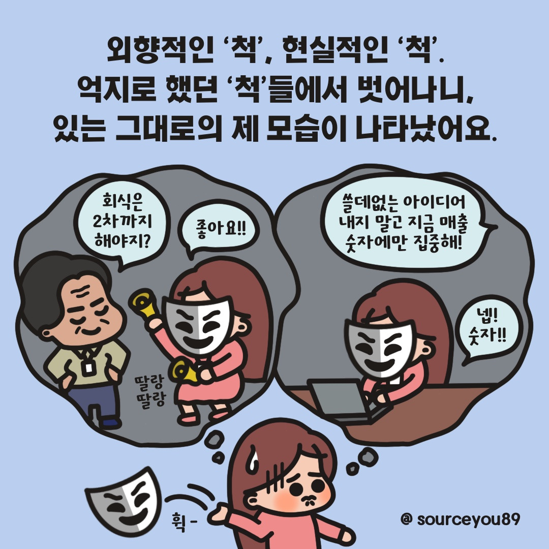 저를 숨기기 위해 외향적인 척, 현실적인 척을 했고, 그렇게 9시부터 6시까지 제가 아닌 상태였기에 퇴근 후 집에 오면 모든 에너지가 소진되었어요.