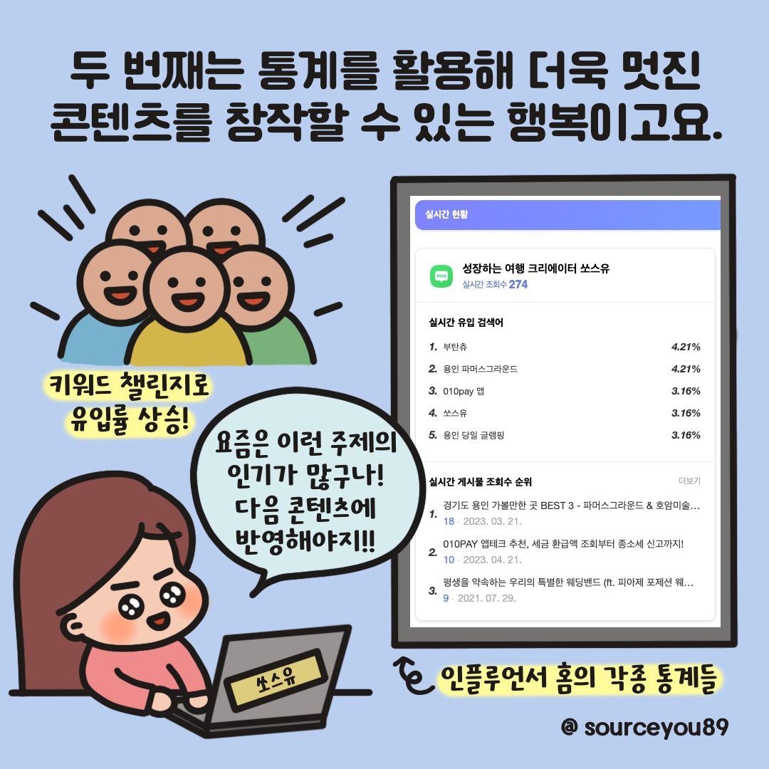“실험을 통해 경험을 얻을 수 없다. 만들 수도 없다. 반드시 겪어야 얻는다.” 저는 알베르 카뮈의 명언에 적극적으로 공감해요. ‘인플루언서가 되면 어떨까?’ 상상과 경험은 많은 차이가 있더라고요. 실패에 대한 생각은 지우고, 일단 경험해 보기를 추천하는 이유에요!