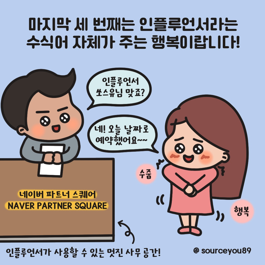 파트너스퀘어 사무실에 앉아서 열심히 일하다가, 문득 행복이 크게 차올라 인스타툰으로 그려봤어요. 여러분도 인플루언서에 도전해 보기를 응원해요! 그리고 궁금한 점이 있다면 언제든 댓글로 물어봐 주세요♥︎