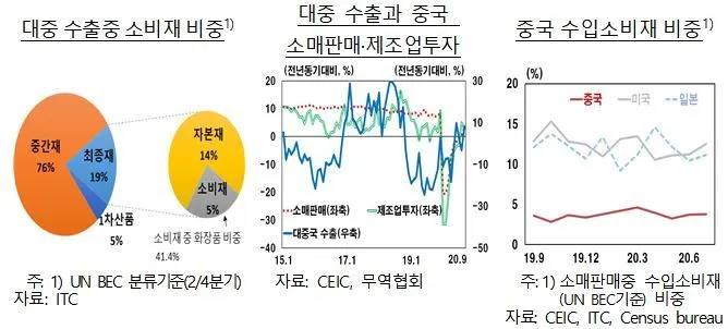 4. [한중 무역] 중국의 경제회복은 빠르지만 우리나라의 대중 수출은 늘지 않고 있어요. 여러 가지 문제가 있지만, ▲ 민간소비가 자동차·가전 등 일부 내구재와 사치재에만 집중 ▲ 자국산 제품 선호도가 높음 ▲ 한국의 대중 수출은 소비재 비중이 낮아서 그렇다고 합니다.