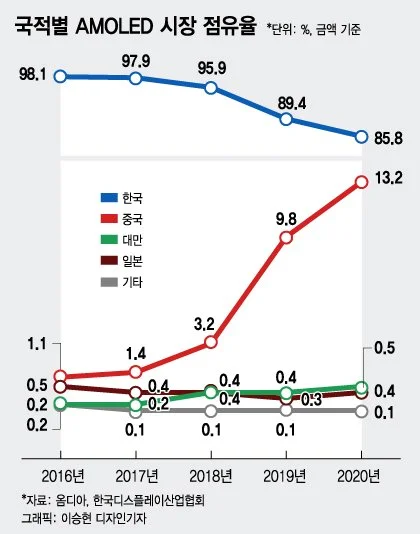 - 단숨에 끌어올린 점유율…4년 만에 '13.2%' ? 15일 한국디스플레이산업협회(KDIA) 등에 따르면 중국은 지난해 프리미엄 스마트폰에 적용되는 능동형 OLED(AMOLED) 시장에서 13.2%의 점유율을 기록. 2016년 1.1%에 불과했던 점유율은 2017년 1.4%, 2018년 3.2%, 2019년 9.8%로 매년 확대. 중국 1위 디스플레이 업체인 BOE는 2017년 0.1%에 그쳤던 OLED 시장 점유율을 4년 만에 8.8%까지 끌어올림. 깐깐하기로 유명한 애플의 품질검사도 지난해 통과. 하반기부턴 아이폰12용 6.1인치 OLED 패널 일부를 납품하기 시작. 한국의 애플 독접 공급 체제가 깨진 것.