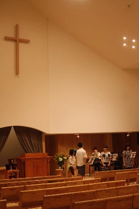 그날 교회 사람들이 찬양 연습을 하고 있었다.