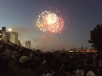 아직 깊게 어두워지지 않은 남색 하늘에 터지는 불꽃이 제법 볼만하다.