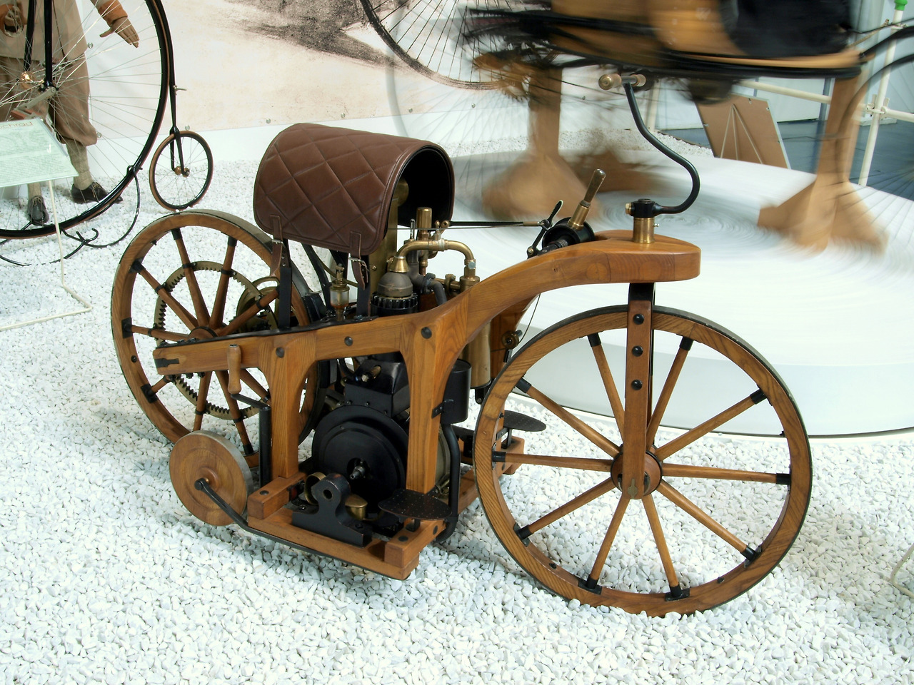 그러나, 바이크는 자동차보다도 더 오래된 운송수단으로 1885년 11월 독일의 고트리프 다임러(Gottlieb Daimler, 1834~1900)가 개발한 라이트 바겐(Reitwagen)이 효시라 할 수 있다. 참고로 칼 벤츠가 개발한 세계 최초의 자동차는 1886년부터 개발을 시작해 1888년에야 상업화에 성공했다.