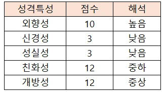 1. 책에 언급된 5대 성격특성 수치(외향성, 신경성, 성실성, 친화성, 개방성)에 대해 이야기해 보아요.