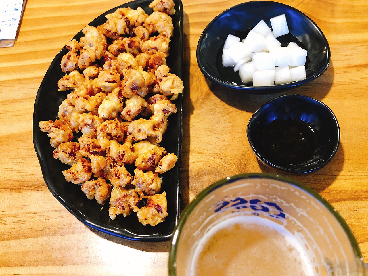 * 닭똥집 튀김과 맥주: 혼자 찾아간 거라 양과 가격을 보고 시킨 닭똥집. 튀김은 바삭하고 닭똥집은 감칠맛 나서 맛있었다. 양도 가성비 매우 풍족하다. 다만 혼자 하나만 계속 먹다 보니 질렸다.