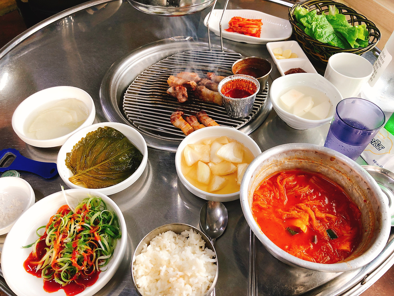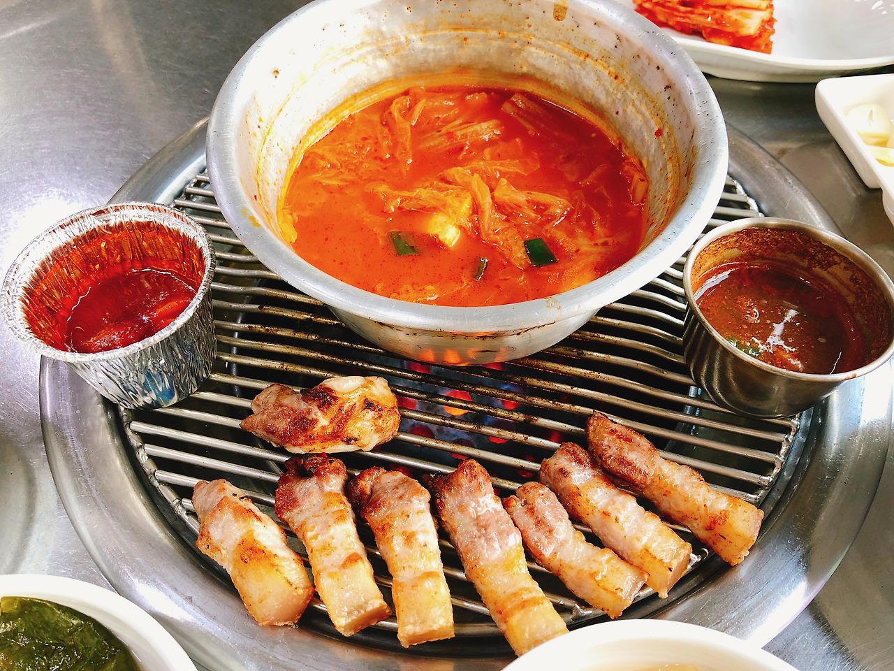 혼자 1인분 주문 가능한 곳, 고기를 구워주시는 곳, 기본 김치찌개 서비스