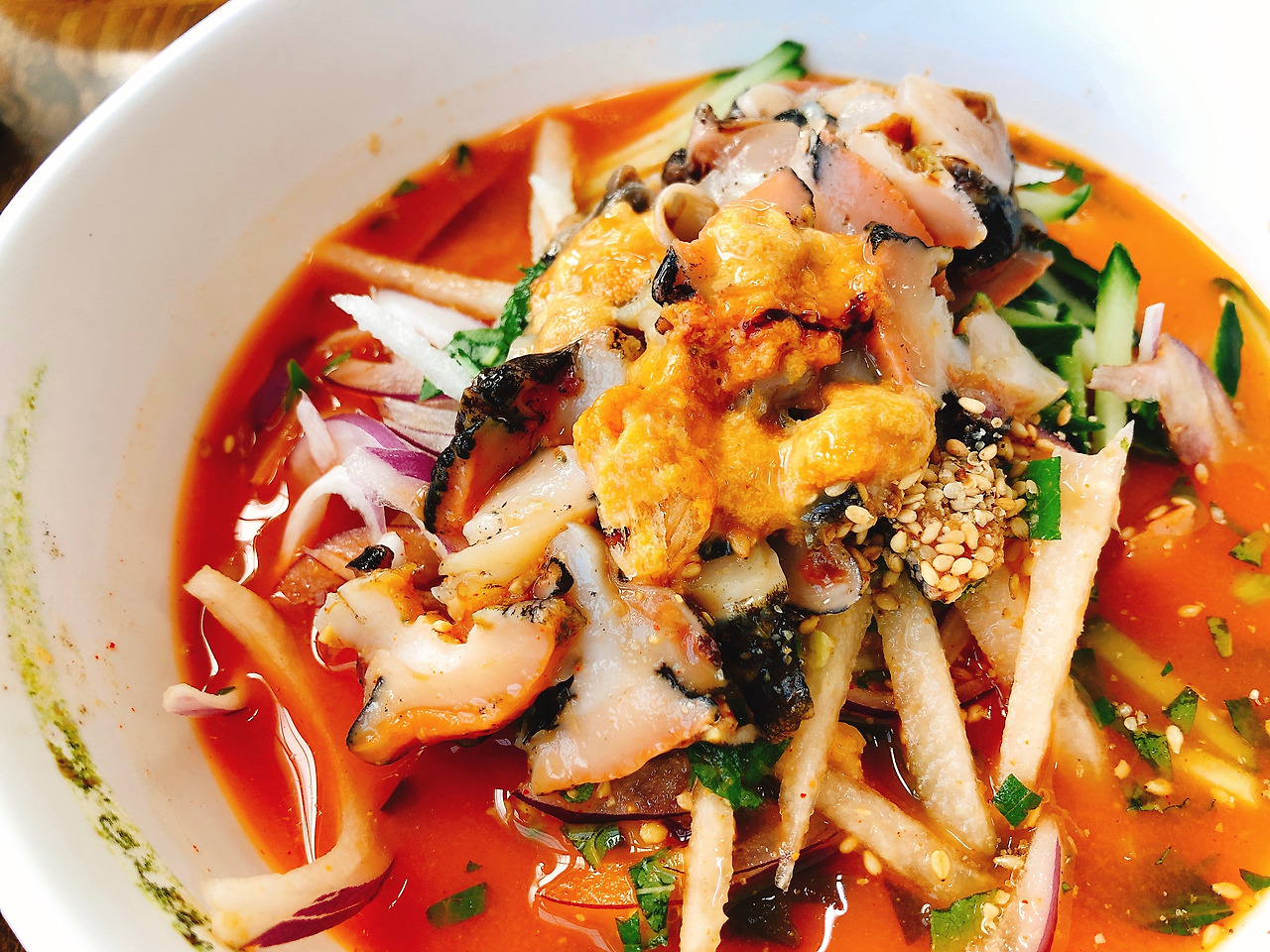 * 소라물회: 소라가 오독오독 씹히는 맛에 시원한 국물에 야채까지 한 입에 넣으면 시원하고 상쾌하다.