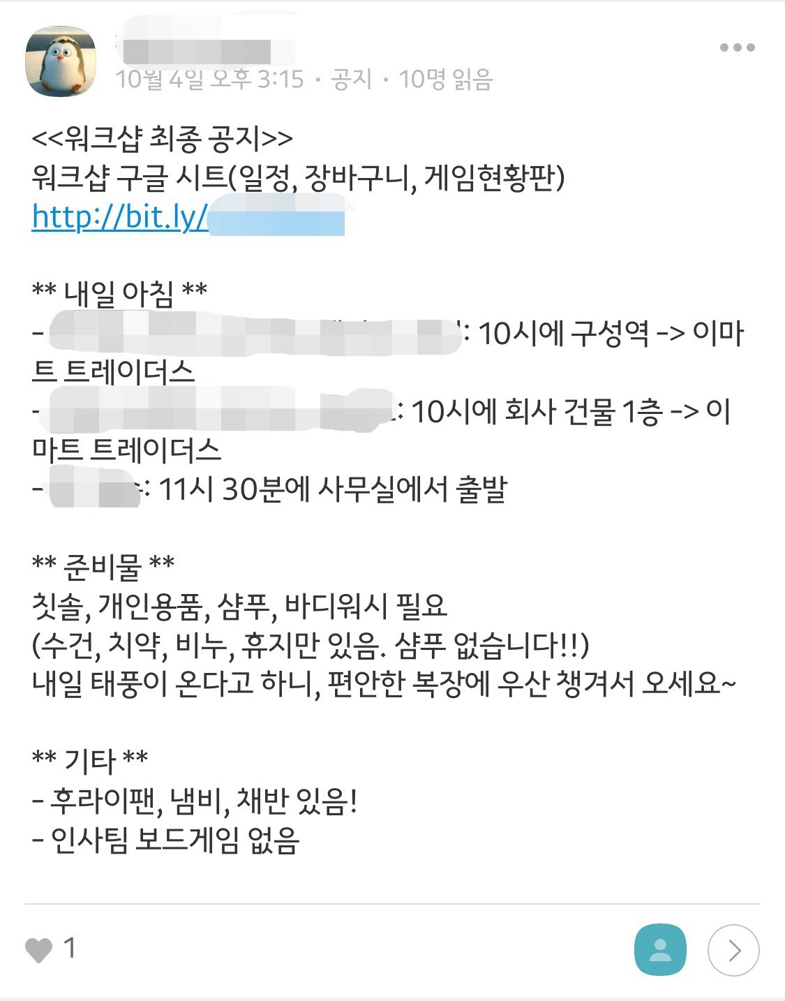 나는 단체활동을 좋아한다. 가족 같은 분위기를 좋아한다는 말은 아니고, 워크샵을 가는 것은 환장한다. 마침 옆 팀과 함께 조인 워크샵을 하게 되었고, 준비와 레크레이션 MC를 맡았다. 하지만 마지못해 워크샵 준비를 떠맡은 그대가 있다면, 나의 후기로 도움을 주고 싶다. 워크샵, 피할 수 없다면 즐기자.