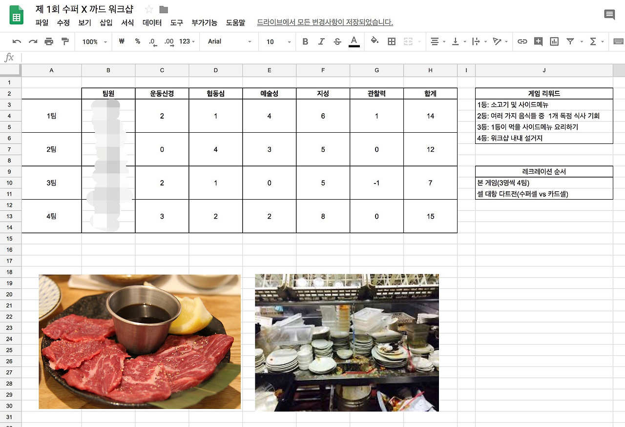 구글 Docs를 이용해 게임 현황판을 만들었다. 참여자들이 게임 점수를 실시간으로 볼 수 있도록 시작 전 미리 링크를 공유했다. 공유 링크 길어서 bitly를 통해 short URL로 만들어 공유했다. (공지사항에 링크가 과도하게 길게 보이는 게 싫어서..)