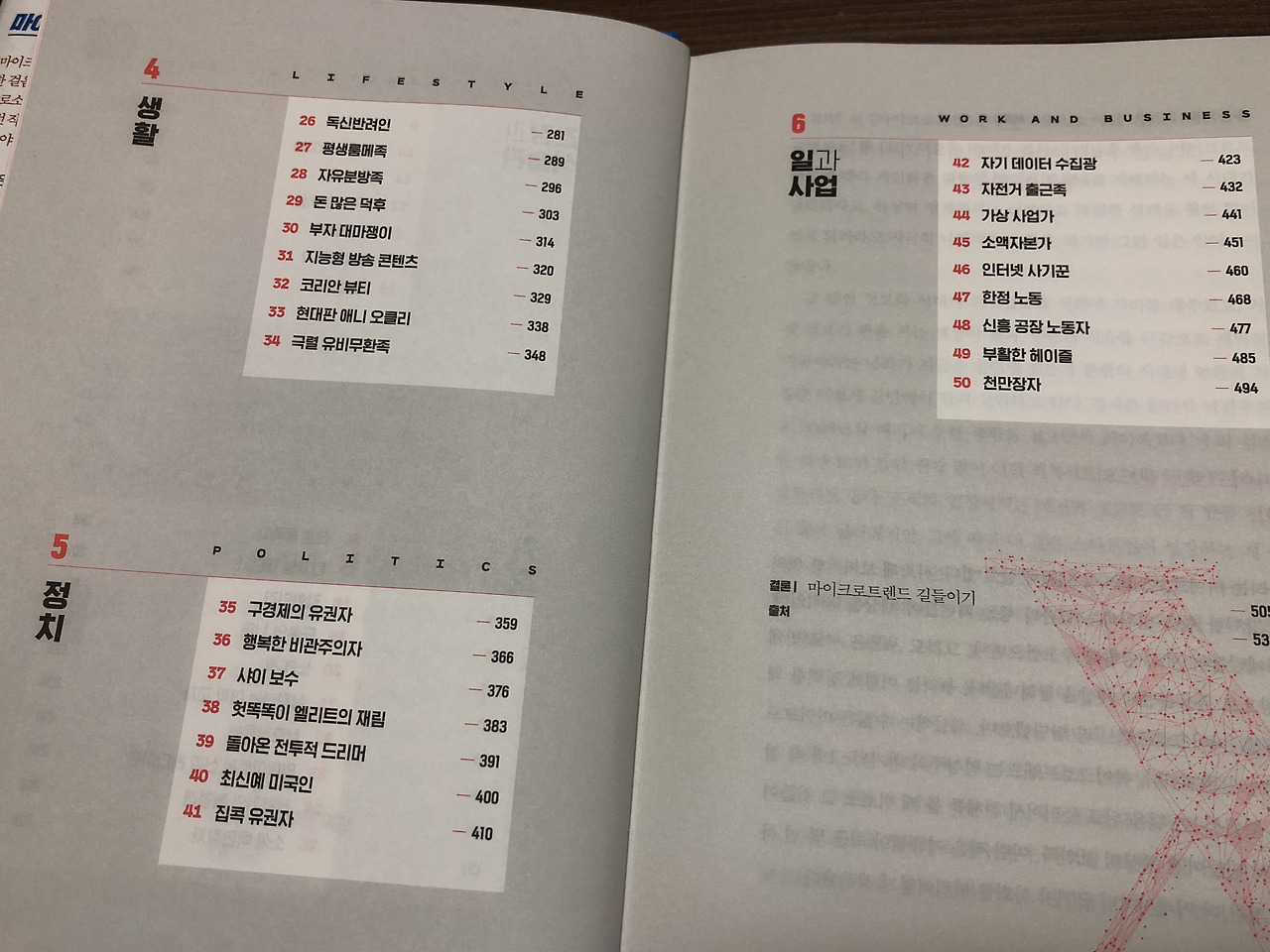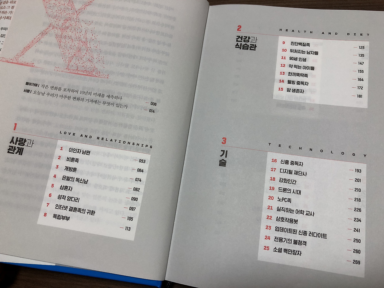 요즘 우리 사회에서 작지만 실제 일어나고 있는 트렌드들을 나열된 텍스트로 접하니 미묘하게 감지하고 있던 것들이 보다 명료해졌다. 반려동물, 인공지능, 웰빙 중독족 등 실제 목격하고 있기에 공감이 쉬웠던 트렌드들도 많았다. 물론 한국사회에서는 나타날 수 없는, 미국이기에 가능한 현상들도 여럿 있었다. 총기를 소지하는 여성들이 늘고 있다는 것, 대마를 하는 부자들은 절대 나타날 수 없으리라.