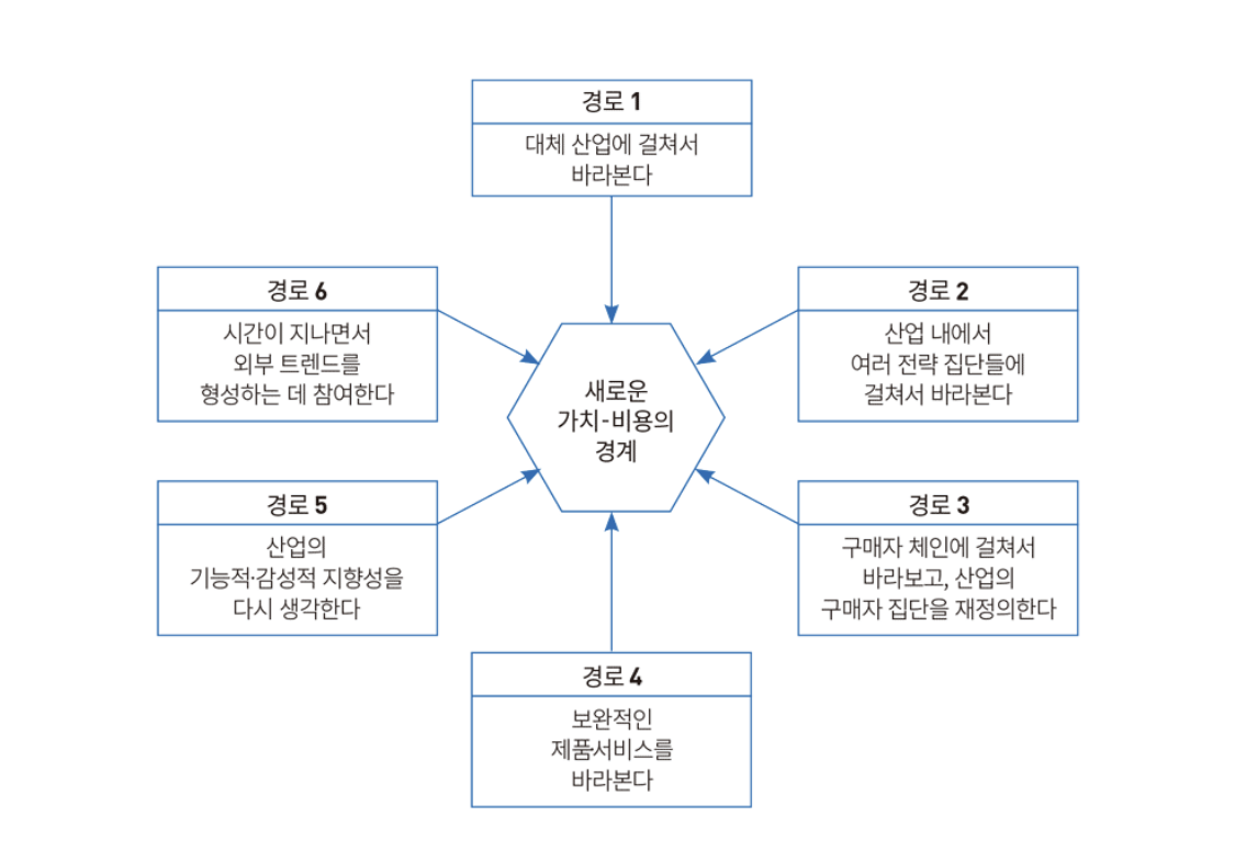 블루오션을 겨냥한다는 것은 차별화와 저비용 모두를 추구하는 것이다. 불가능할 것 같다는 생각이 드는 것은 우리가 기존 산업의 둘레에 시야를 가두고 생각하기 때문이다.