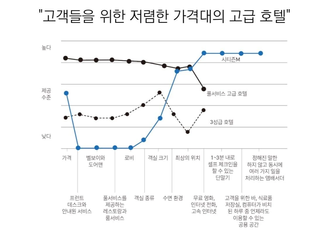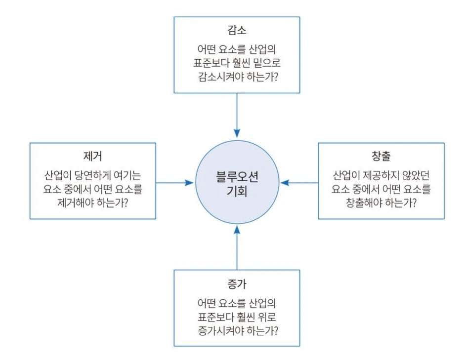 기존 시장(레드오션)에서 가격 경쟁과 기능 추가라는 단순한 방법론을 넘어 아예 새로운 시장을 개척하라고 강조한다.