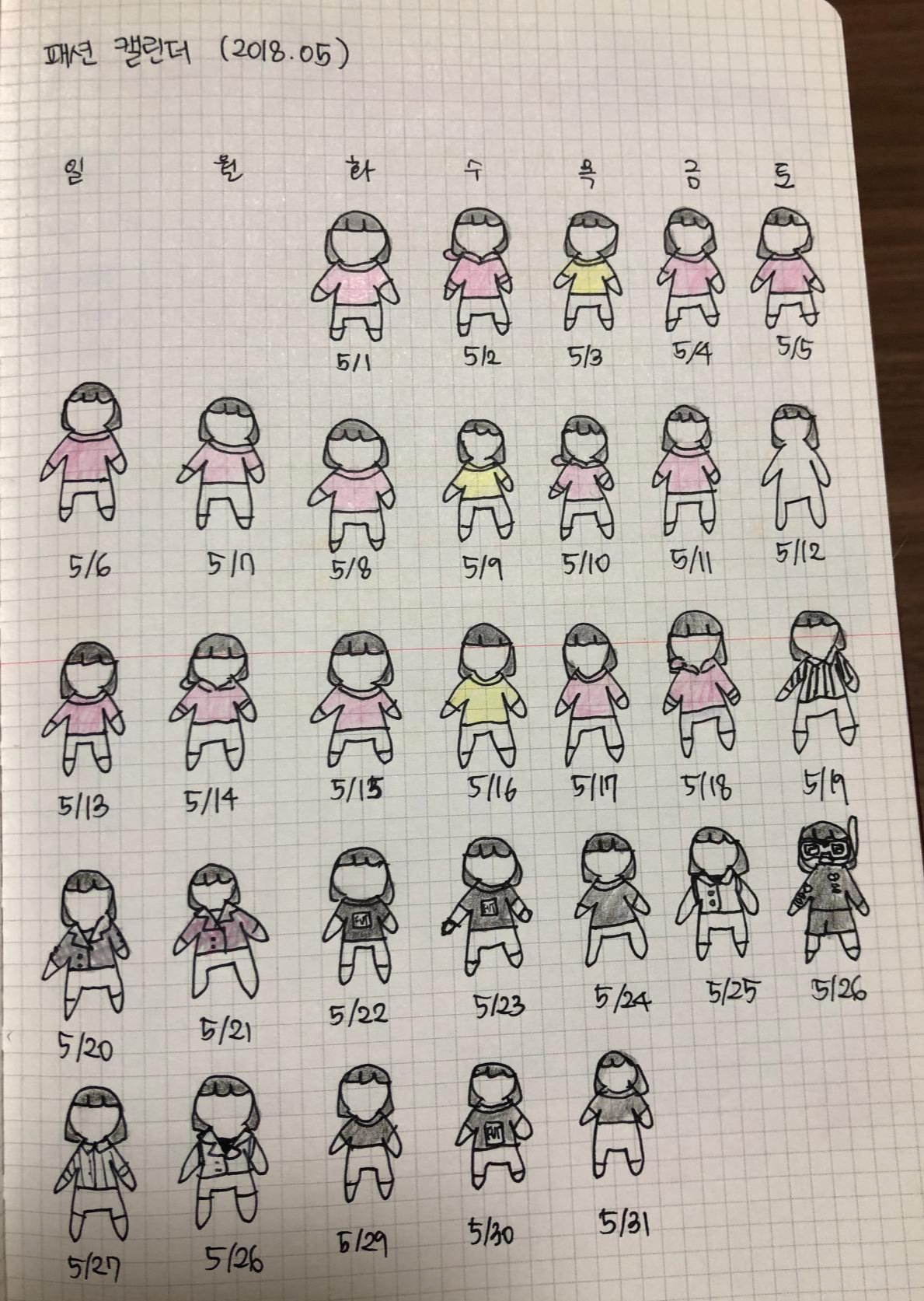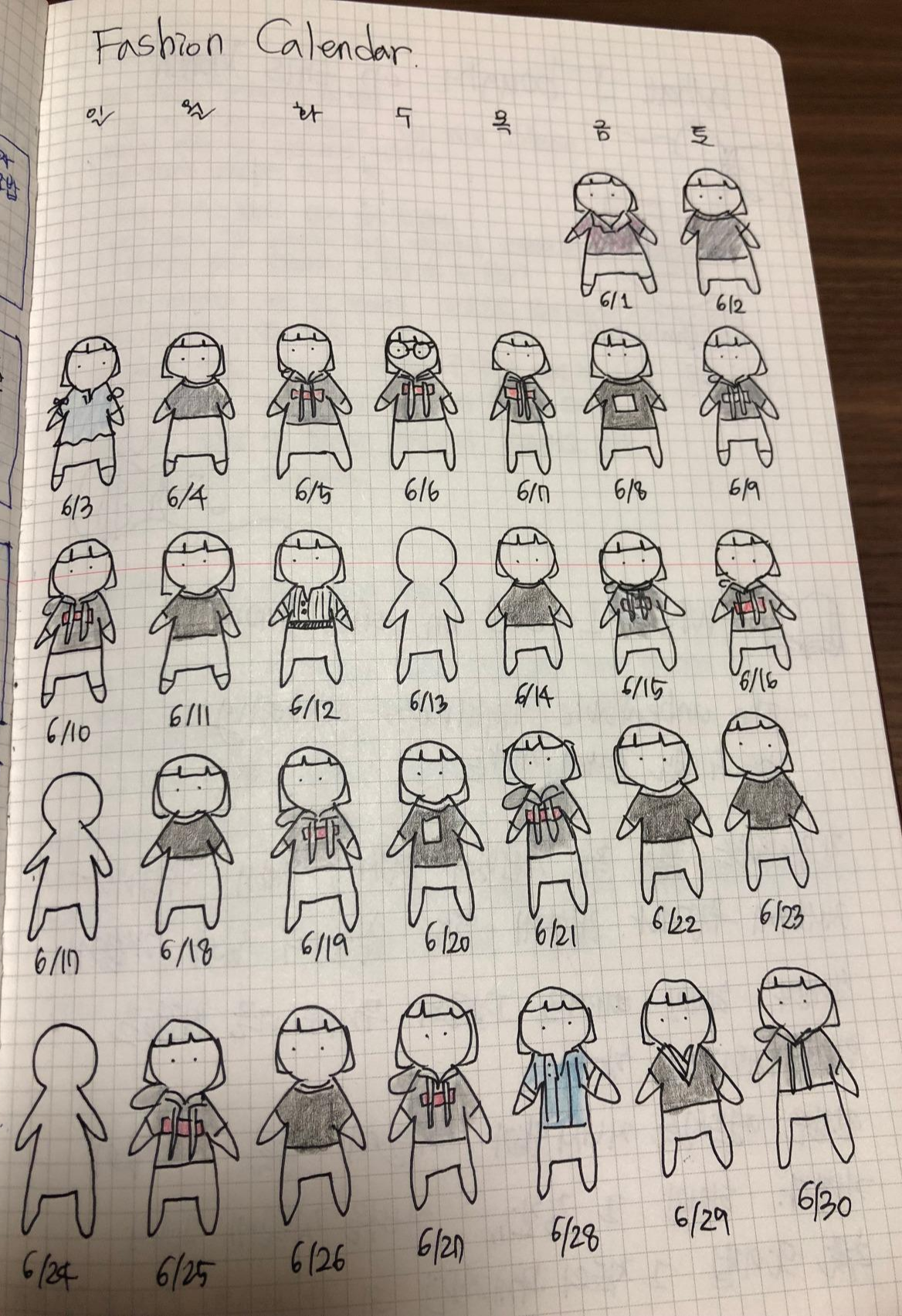 원래 불렛 저널을 작성하고 있었기에 한 면에다가 나를 31개 그리고, 매일매일 내가 어떻게 옷을 입게 되는지 기록해봤다. 이 캘린더를 시작했을 때가 5월 중반이라 지난 옷차림들을 적어내려 보았더니..