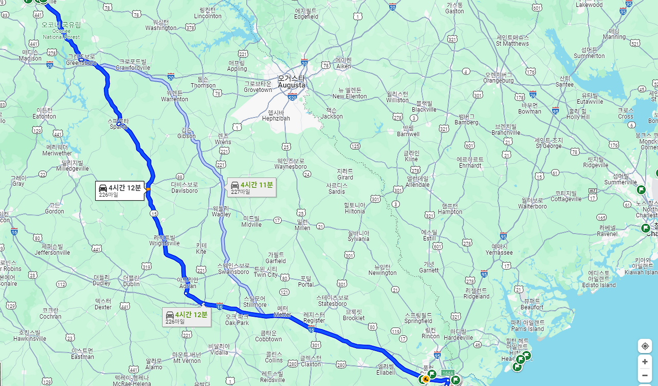 서배너까지는 4시간 남짓 걸린다. 가는 도중에 속도가 갑자기 줄어드는 구간이 많으니 속도위반을 조심해야 한다는 조언들이 있었다. 실제 가보니 고속도로 비중이 경로의 3분의 1 정도밖에 되지 않았다. 초반 2시간 이상이 작은 타운들을 통과해 가는 길이었는데, 덕분에 마을 구경은 가능했다. 찰스톤에서 돌아올 때는 경로의 3분의 2 이상이 고속도로여서 대조적이었다.