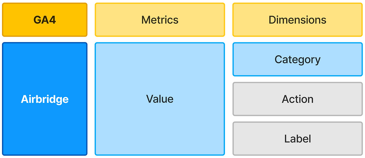GA4의 측정기준(Dimensions)이 에어브릿지의 카테고리, 액션, 라벨의 역할을 하고,