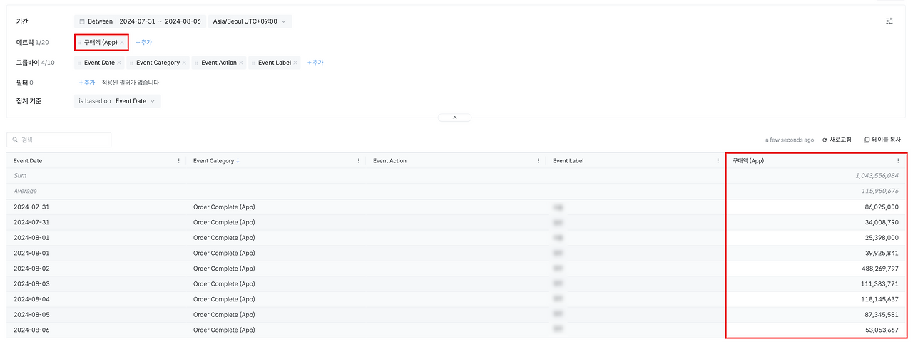 위 예시와 같이 액션과 라벨, 밸류 모두 숫자로 수집한다고 하더라도 밸류로 수집한 데이터만 계산할 수 있으며, 액션과 라벨로 수집한 데이터는 계산할 수 없습니다. 예시에서는 구매 완료 이벤트의 밸류로 수집한 데이터를 더해서 30,000이라는 수치를 얻을 수 있습니다. 단, 카테고리(이벤트)와 동일하게 이벤트가 발생한 횟수는 확인할 수 있습니다. 구매 완료 이벤트의 액션 중에서 1,000이라는 속성이 2번 발생한 것을 에어브릿지 리포트에서 확인할 수 있습니다.