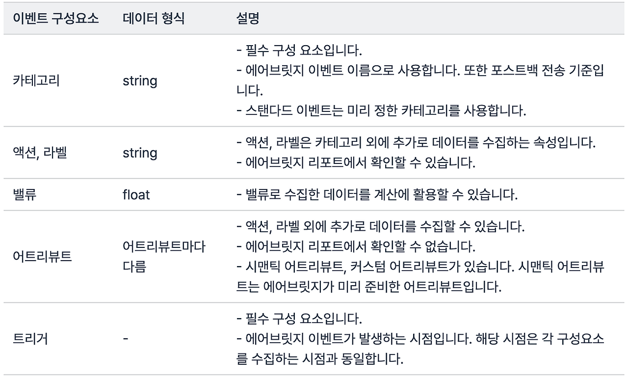 에어브릿지 이벤트 구성 요소에는 카테고리(Event Category), 액션(Event Action), 라벨(Event Label), 밸류(Event Value), 어트리뷰트(Attribute), 트리거(Trigger)가 있습니다.