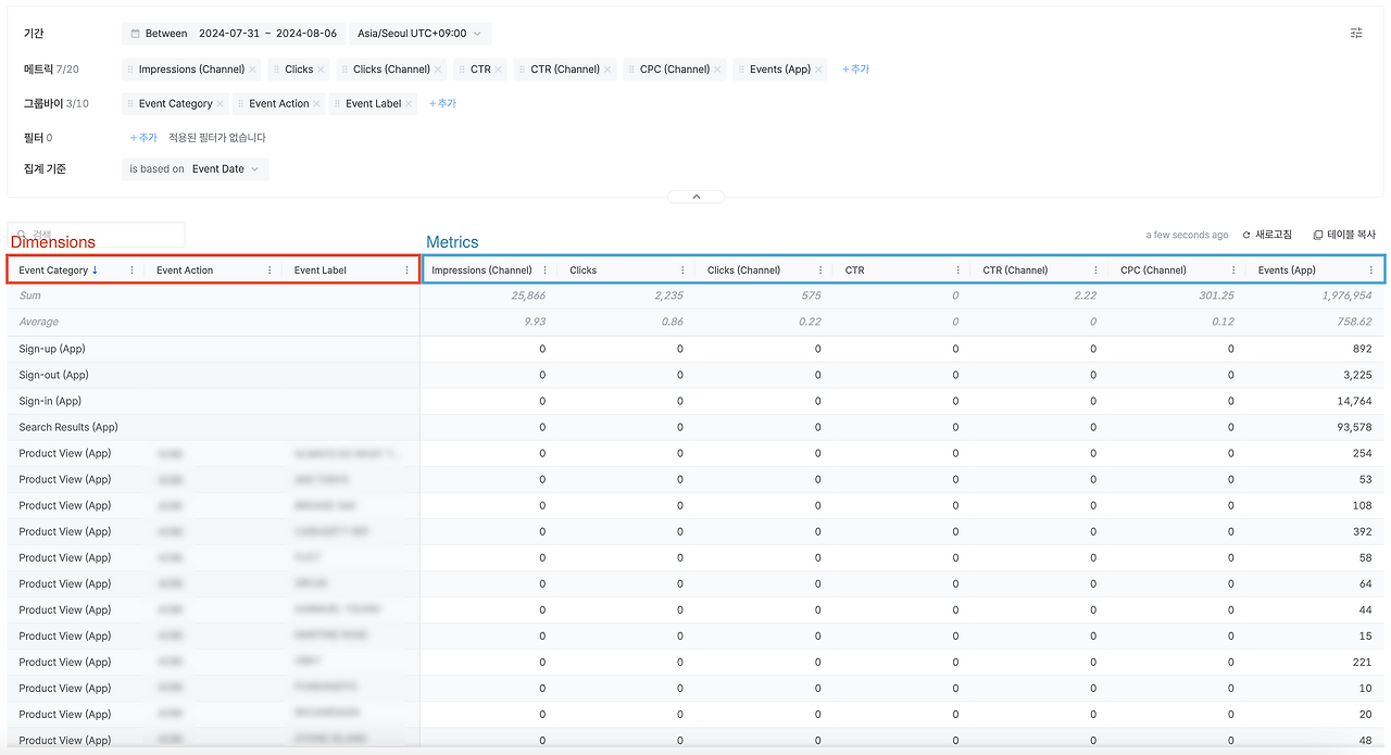 다시 말해, 1개의 카테고리와 2개의 어트리뷰트(액션, 라벨)에 대한 통계를 에어브릿지의 리포트와 대시보드에서 쉽고 빠르게 확인할 수 있습니다.