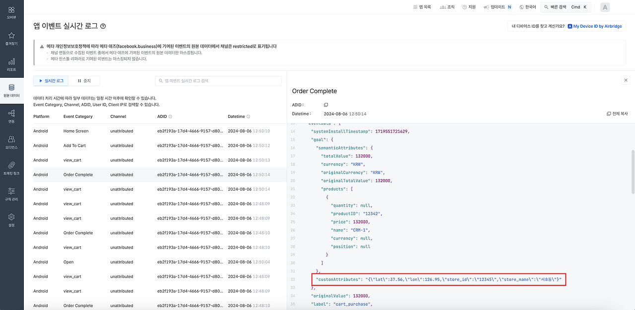한 가지 유의사항이 있다면, 에어브릿지 커스텀의 경우 원본 데이터 추출에서 수집된 모든 속성 데이터가 같은 칼럼에 담긴 상태로 확인이 가능합니다. 아래 실시간 로그에서 형태를 확인하실 수 있습니다.